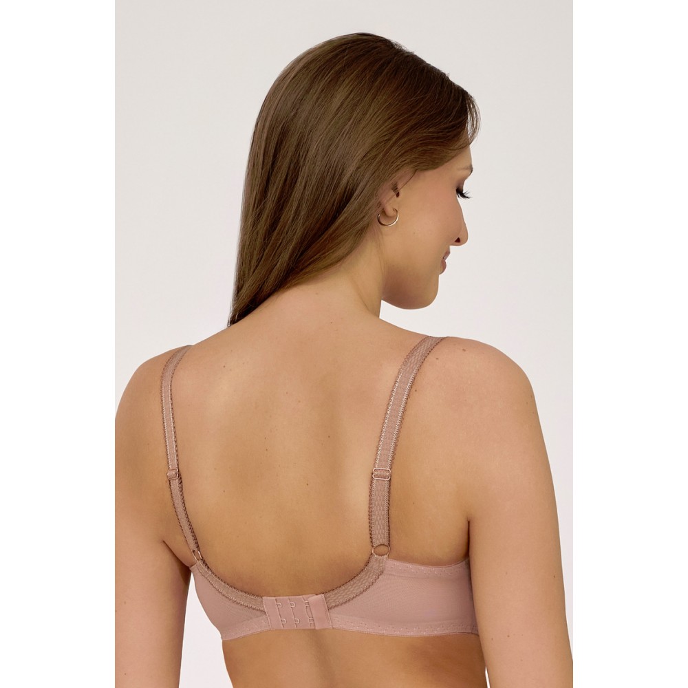 AV 2226 Macchiato Semi Soft to model, który urzeka subtelnym połączeniem kawowego beżu z delikatną koronką w odcieniu złamanej bieli. Konstrukcja Semi Soft – z dolną częścią miseczek usztywnioną pianką i górą z transparentnego tiulu zdobionego koronką – pięknie podtrzymuje i unosi biust, nadając mu naturalnie zaokrąglony kształt.