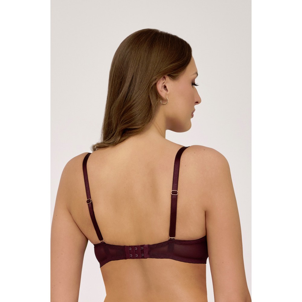 Absolutnie olśniewający AV 2232 w szlachetnym odcieniu czekoladowego brązu to model, który podkreśla kobiecość w najbardziej zmysłowym wydaniu. Miseczki typu push up z komfortowymi poduszeczkami unoszą i zaokrąglają piersi, a misterna koronka w kwiatowe wzory kusząco zaakcentuje linię dekoltu. Subtelna, biżuteryjna zawieszka w centrum mostka dodaje całości eleganckiego blasku i finezji.