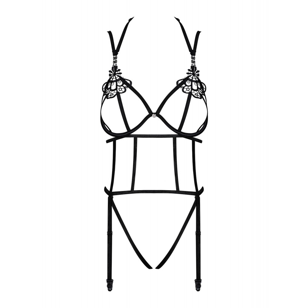 П'янкі ночі, наповнені гарячими моментами разом - відтепер ви більше ні про що думати не зможете! Тонкі бретелі, які сексуально обвивають ваше тіло, розв’яжуть ваші найпотаємніші фантазії, втілення яких ще ніколи не було таким простим і... таким приємним! Пориньте в океан сексуальної привабливості і дозвольте себе захопити хвилею насолоди, яка приведе вас прямо до незабутнього фіналу вечора! Всі спокусливі деталі: чорне відкрите боді Badossa, незвичайні бретельки, що обвивають тіло - унікальний крій, елегантний гіпюр на грудях - оригінальне оздоблення, відкритий бюстгальтер на кісточках - пікантні відчуття і красивий вигляд грудей, відкрита промежина - гарантія жару. відчуття, лямки в промежині відстібаються та регулюються, багатоступенева застібка - ідеальна посадка, відстібаються, регульовані підв'язки, приємні на дотик, еластичний матеріал (44% поліамід, 56% еластан)