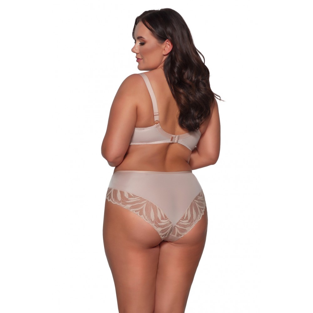 Нижні чашечки підкладені м’яким поролоном, зовні покриті еластичною трикотажною тканиною. Верхні чашечки виготовлені з щільного плетеного квіткового мережива, яке плавно облягає форму грудей і поступово піднімається вгору по бретельках. Декоративна перемичка та гумка підкреслені металевою пластиною з логотипом, розташованою не лише по центру між грудьми, але й ззаду за допомогою застібки.