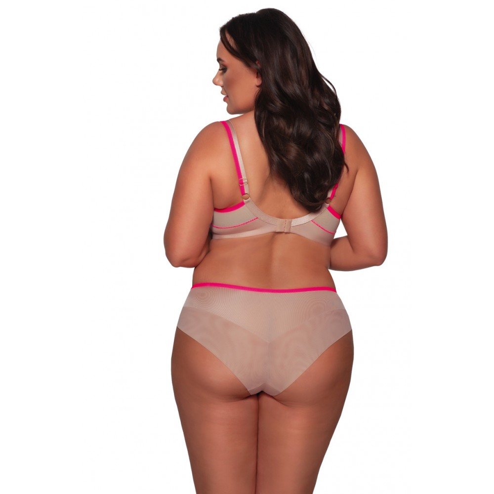 Biustonsoz półusztywniony, miseczki od wewnątrz wyścielone zostały miękką pianką dla optymalnego kształtowania piersi, na zewnątrz zaś pokrywa je cielisty tiul przecięty różowym szwem oraz niebanalny kwiatowy haft w energetycznych odcieniach wyciągnięty poza miski. Różowe lamówki tworzą swoistą ramę biustonosza, a dwukolorowe ramiączka i haftowane wstawki rozpięte między ramiączkiem a miseczką dodają lekkości i uroku. Bestsellerowa konstrukcja należycie zadba o zebranie i uniesienie biustu, a także o jego komfortowe podtrzymanie, a fikuśne figi świetnie uzupełnią całość. Zakochaj się w barwnej Tropei!