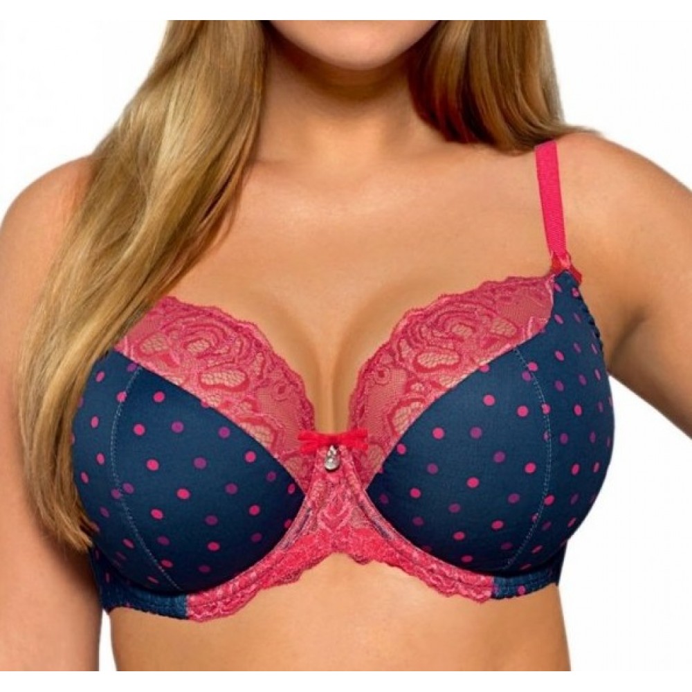Słodki biustonosz typu Full Cup. Finezyjna dzianina w groszki wykończona dodatkami w kolorze cukierk..