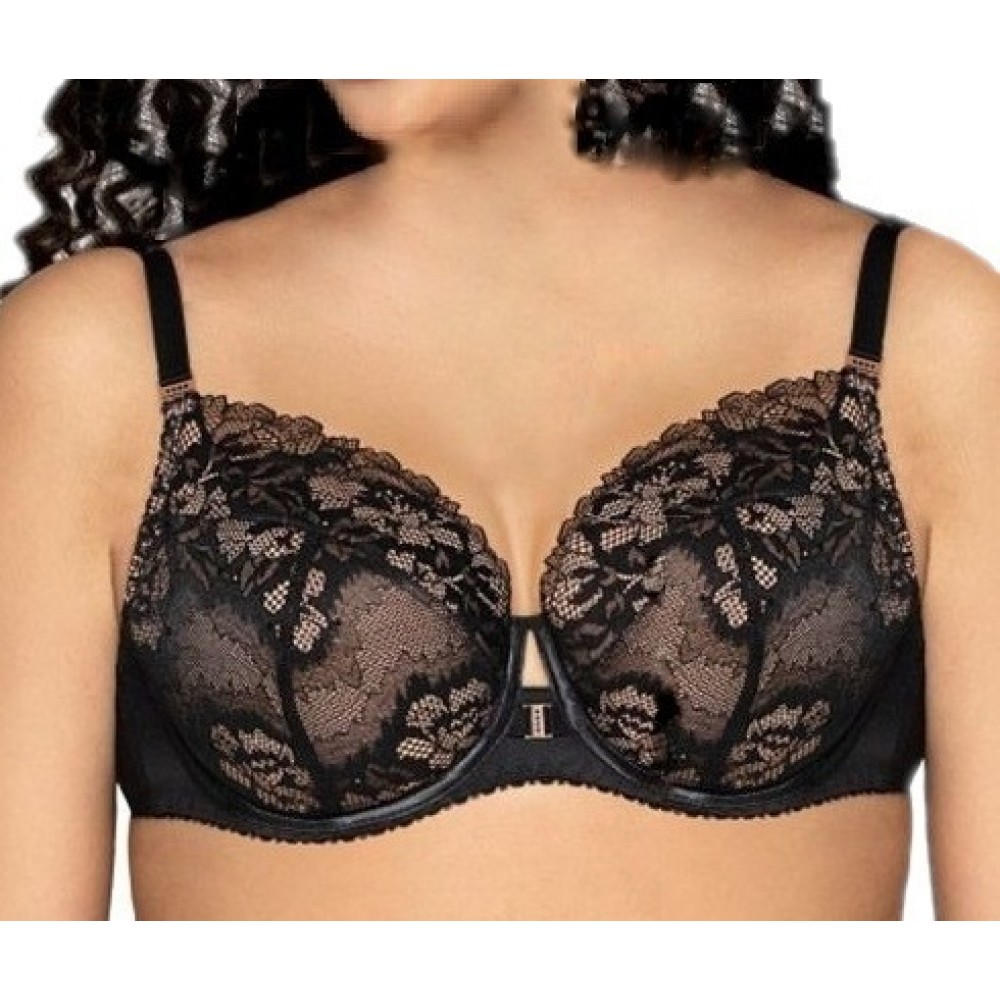 Biustonosz z usztywnianymi miseczkami, górna linia z delikatnej siateczki ozdobiona kwiatowym motywe..