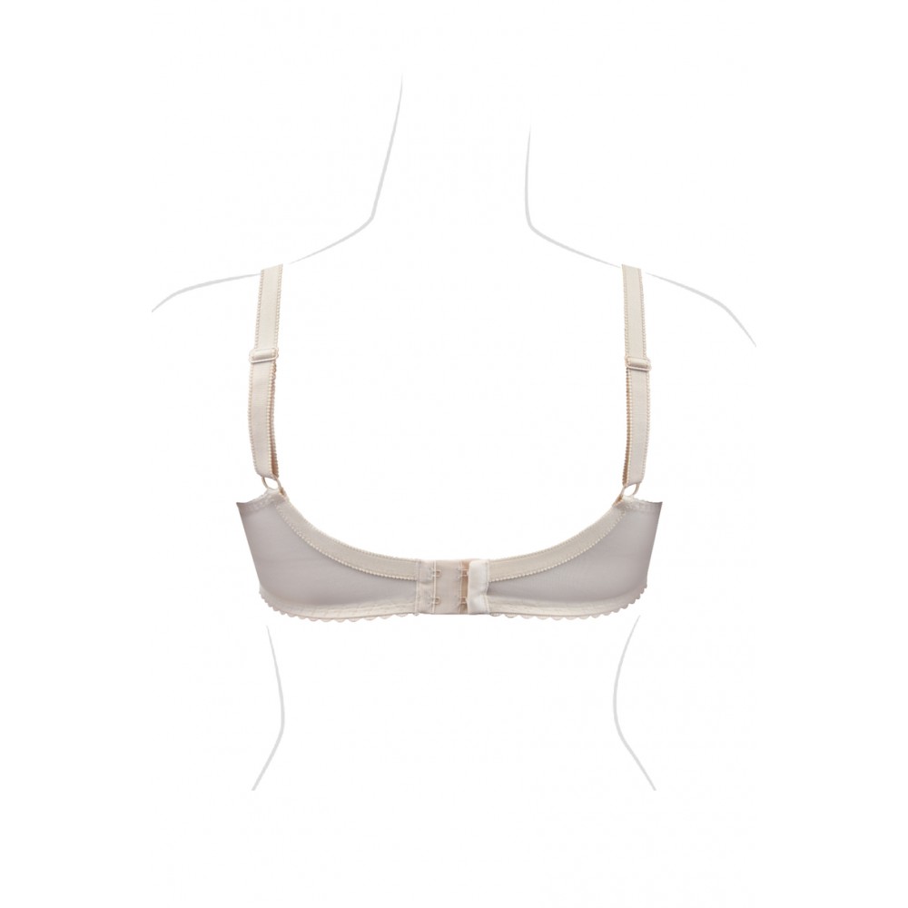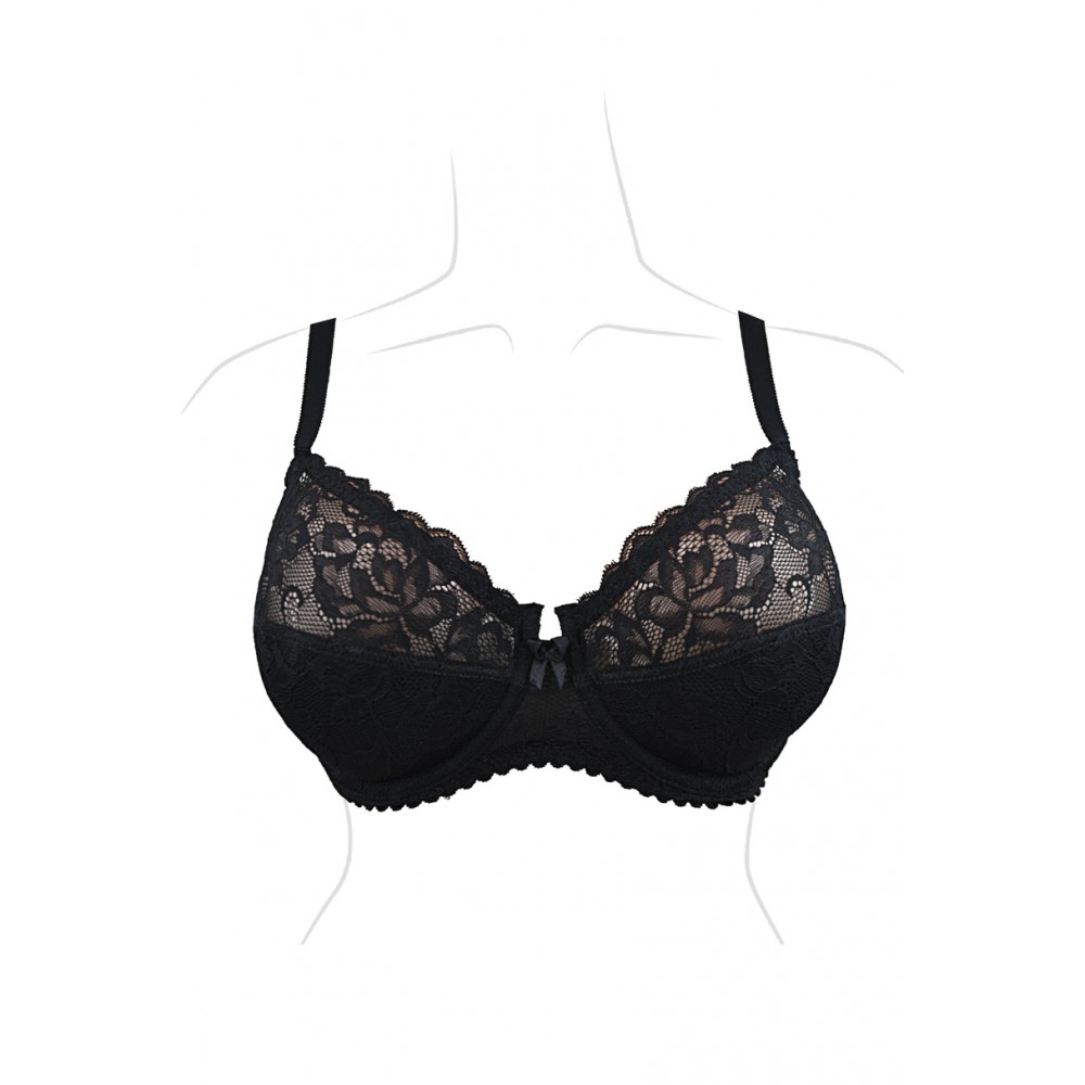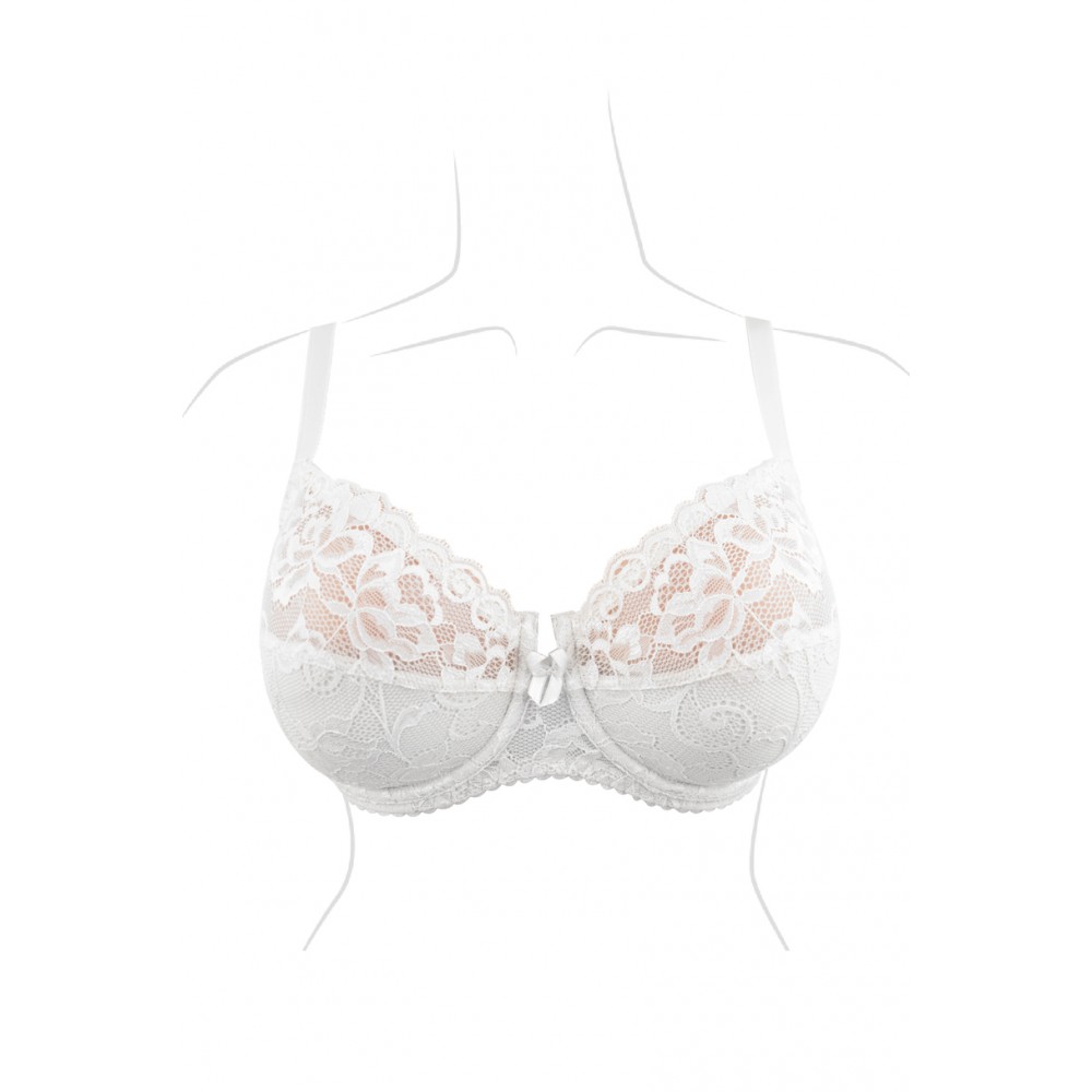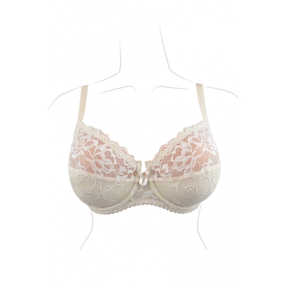 М'який бюстгальтер на кісточках, який забезпечує грудям бездоганний вигляд та підтримку. Чашечки виготовлені з квіткового мережива з нижньою частиною на бавовняній підкладці. Додаткова стабілізуюча бавовняна підкладка проходить від низу чашки до бретельок, забезпечуючи додаткову підтримку. Бічні сторони виготовлені з міцної тканини, схожої на лайкру. Товщина бретельок варіюється залежно від розміру бюстгальтера та регулюється ззаду. Склад: 25% бавовна, 58% поліамід, 17% еластан.