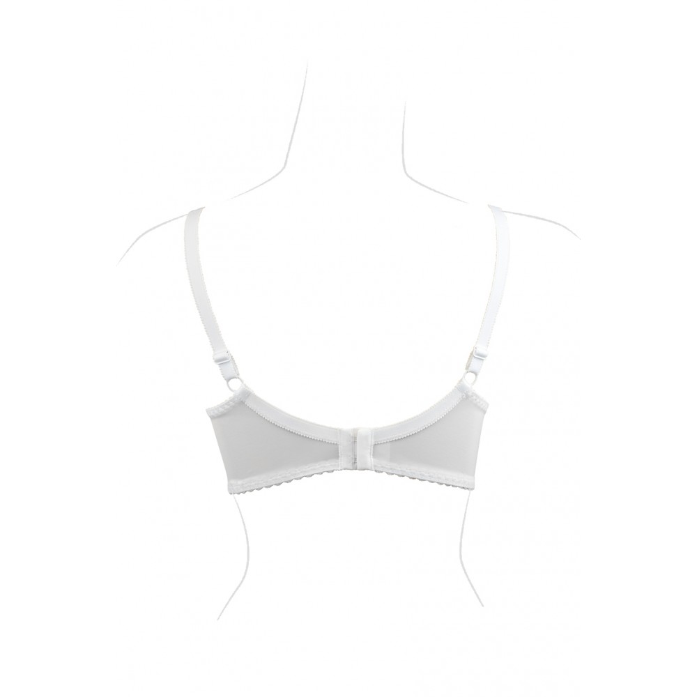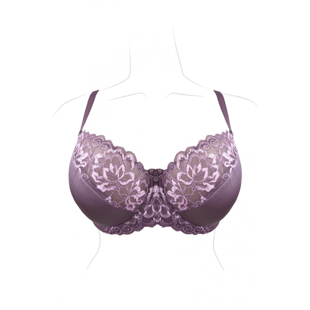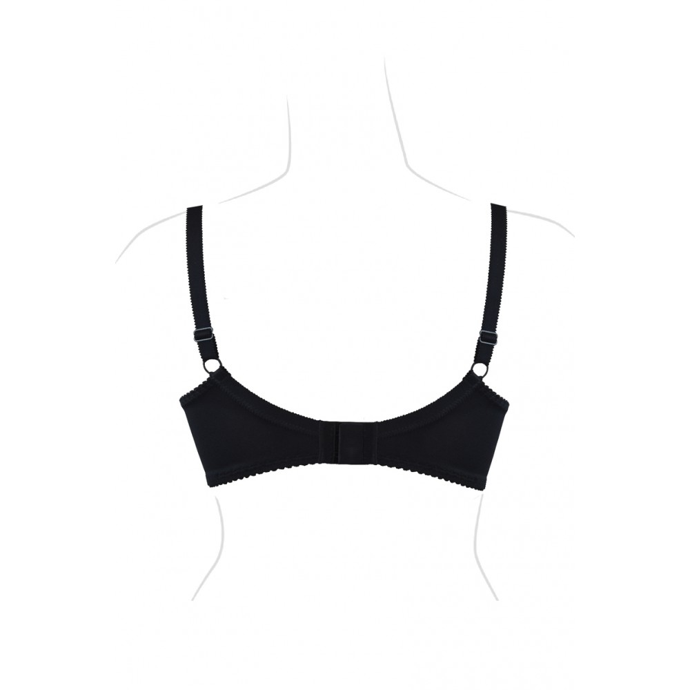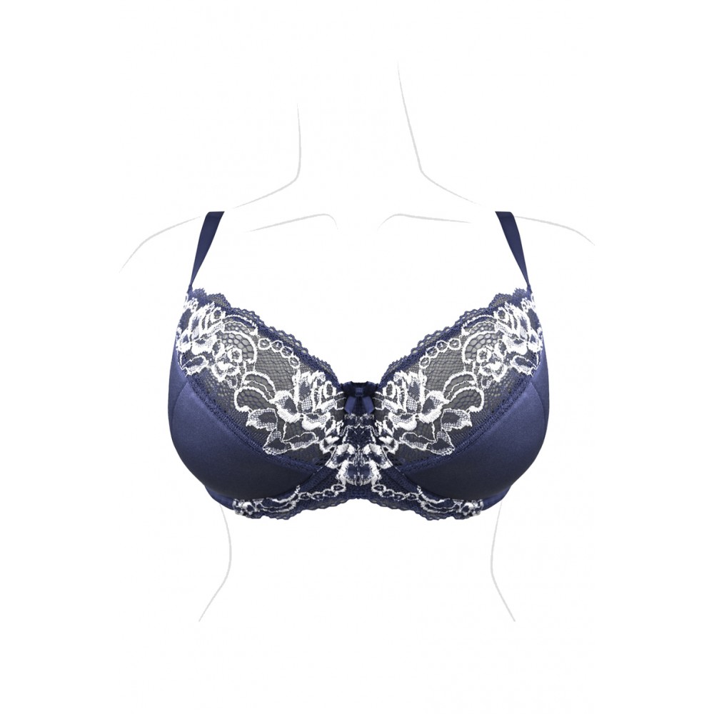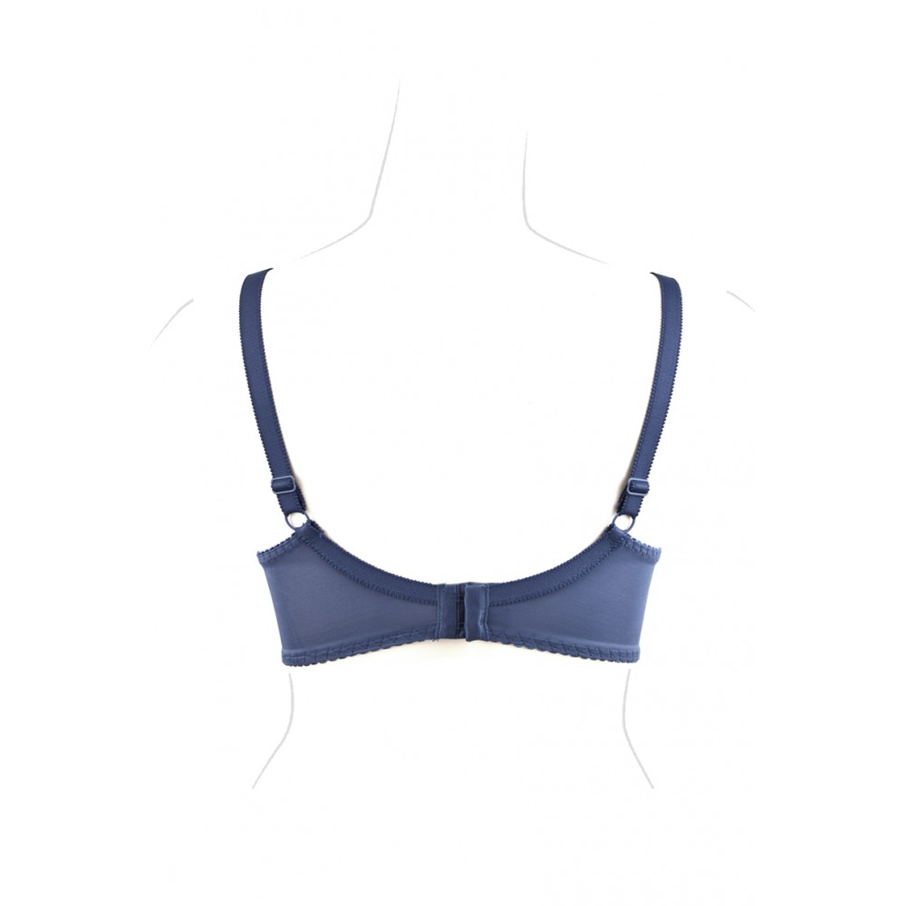 Цей напівм'який бюстгальтер ідеально облягає груди, стабілізуючи їх та підкреслюючи їхню красу. Ідеально підходить для більших грудей. Внутрішня частина чашки підкладена бавовною, тому кожен бюст оцінить її м'якість. Товщина бретельок залежить від розміру бюстгальтера. Бретелі регулюються ззаду. Бічні частини виготовлені з міцної тканини лайкра, посиленої вертикальною кісточкою. Склад: 5% бавовна, 71% поліамід, 24% еластан.