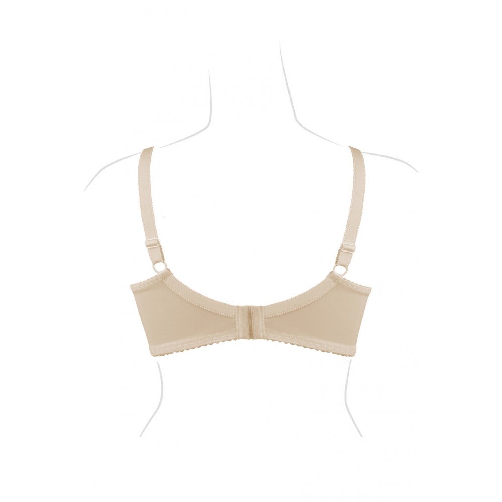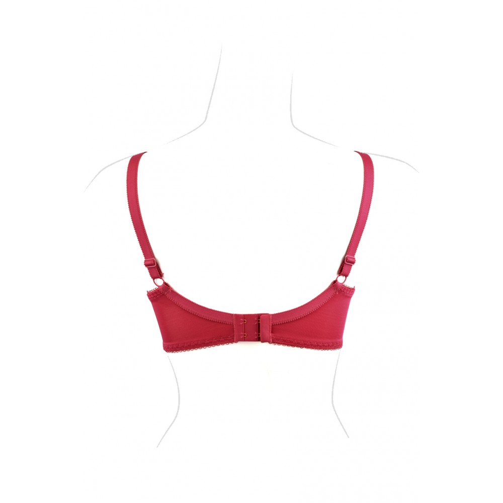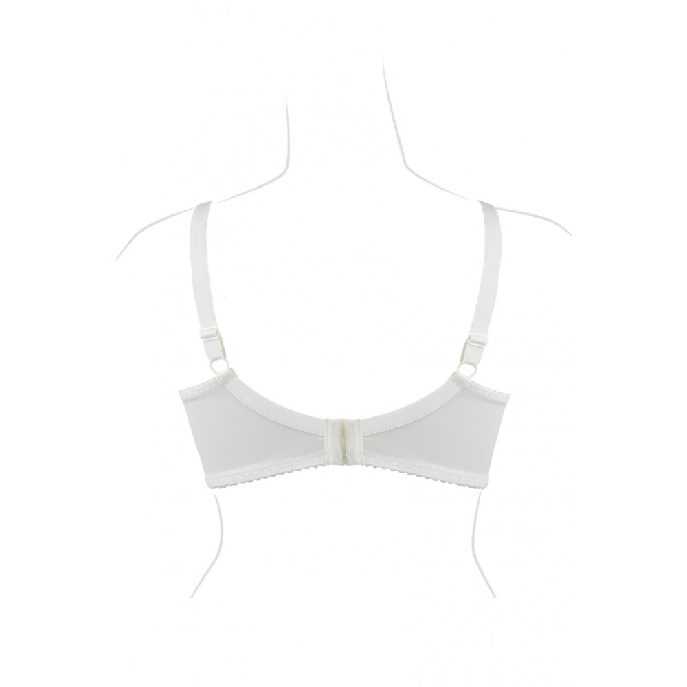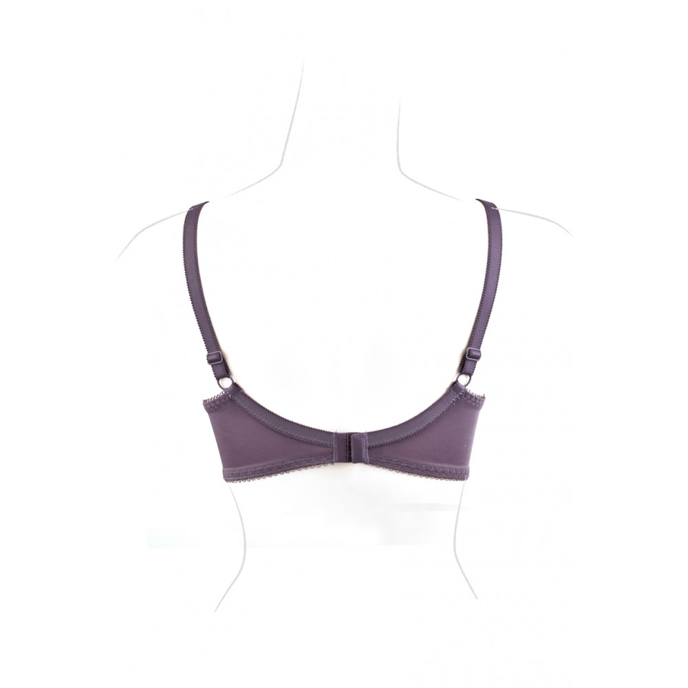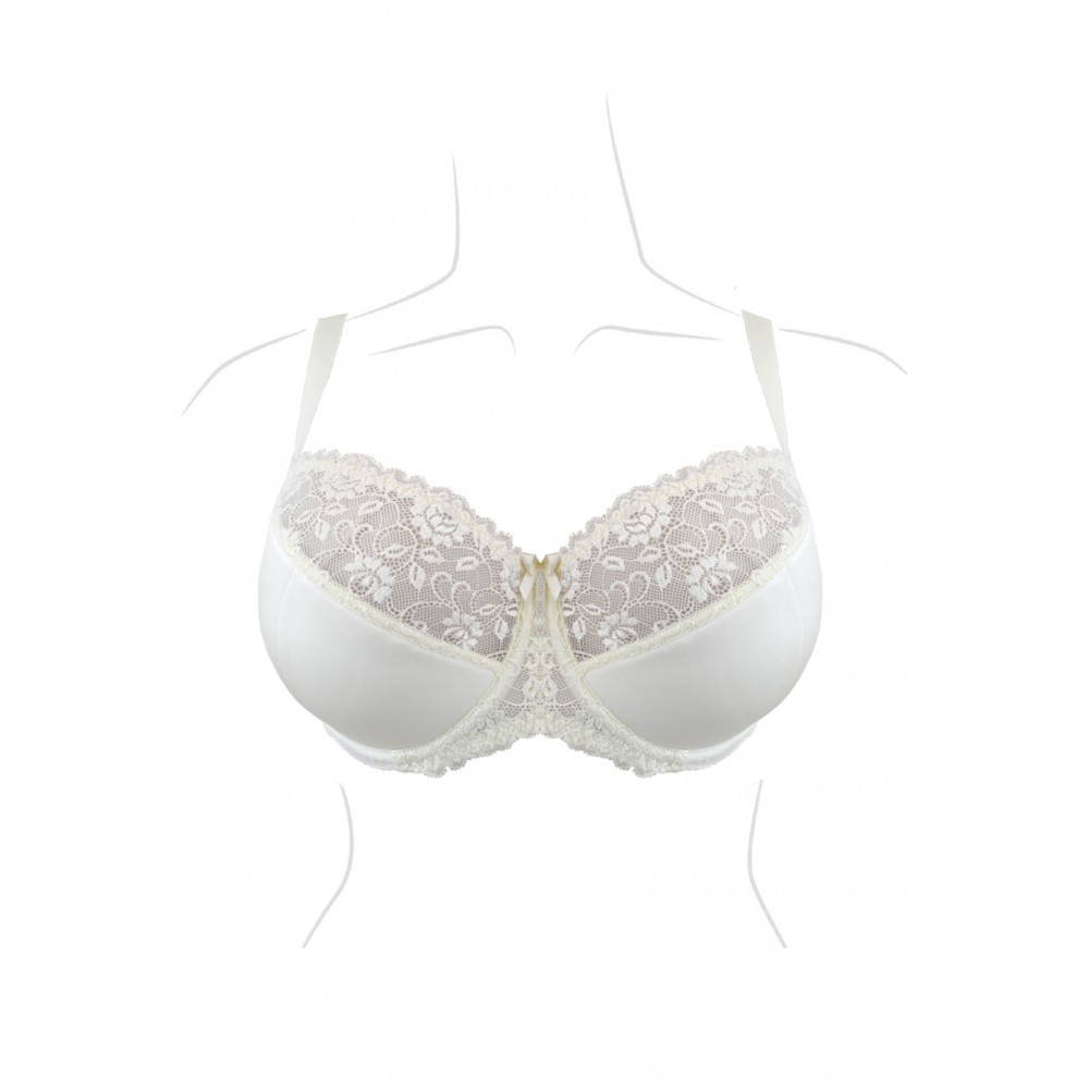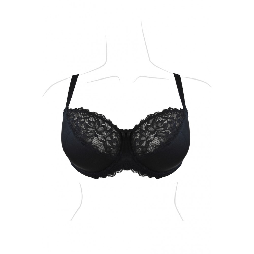 Цей напівм'який бюстгальтер ідеально облягає груди, стабілізуючи їх та підкреслюючи їхню красу. Ідеально підходить для більших грудей. Внутрішня частина чашки підкладена бавовною, тому кожен бюст оцінить її м'якість. Товщина бретельок залежить від розміру бюстгальтера. Бретелі регулюються ззаду. Бічні частини виготовлені з міцної тканини лайкра, посиленої вертикальною кісточкою. Склад: 5% бавовна, 71% поліамід, 24% еластан.