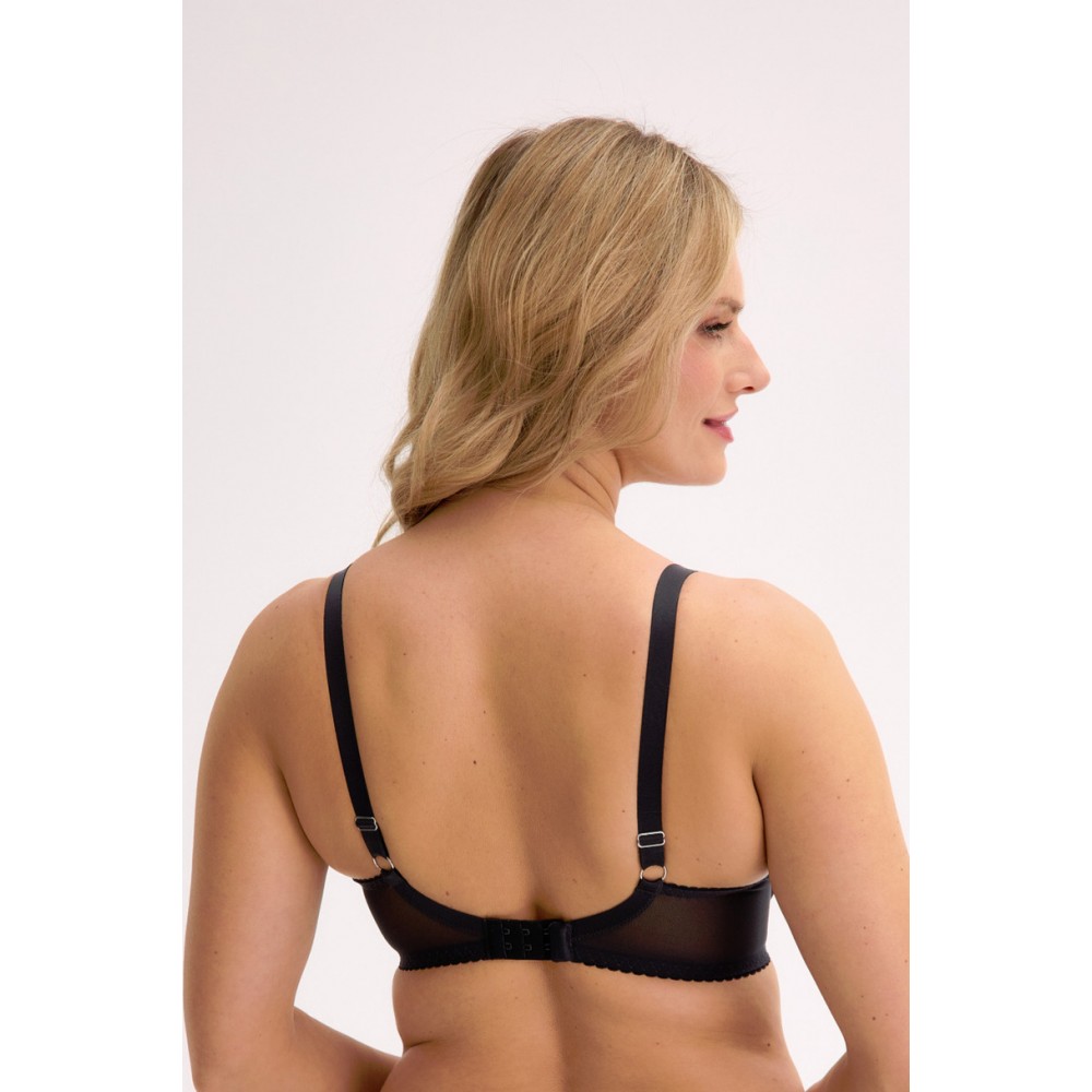 Цей чорний напівм'який бюстгальтер – позачасовий вибір для жінок, які цінують елегантність та впевненість у собі. Ця модель вирізняється ніжним квітковим мереживом, що прикрашає нижні чашечки та переходить у легку, прозору сітку у верхній частині грудей. Напівм'яка конструкція забезпечує чудову підтримку та природне формування, а контурні кісточки та стійка стрічка гарантують комфорт протягом усього дня. Цей класичний фасон завжди виглядає стильно – ідеально підходить як для щоденного, так і для вечірнього носіння.