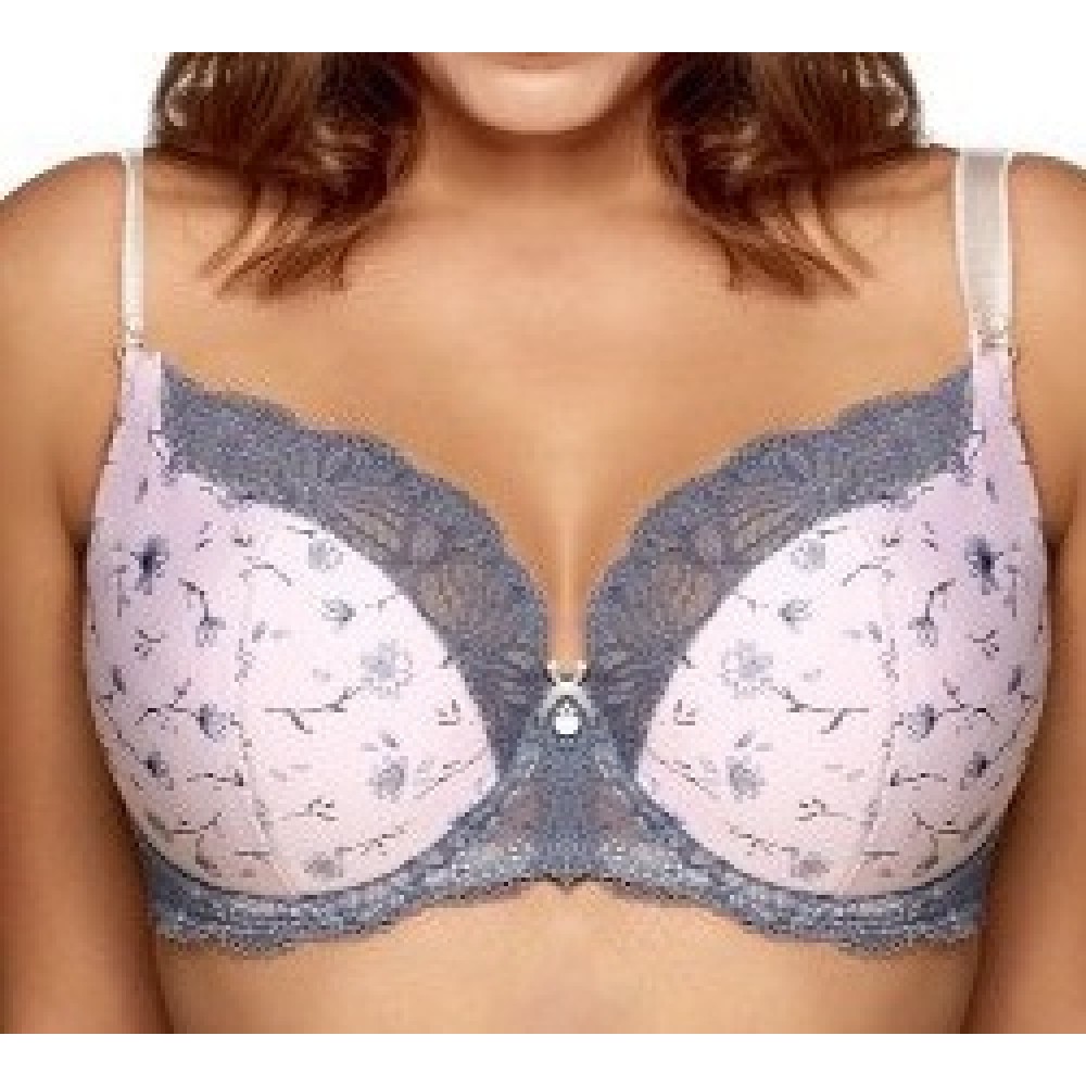 Жіночий бюстгальтер з візерункової мікрофібри з квітковим мотивом і мереживом. Напівмягкі чашки на к..