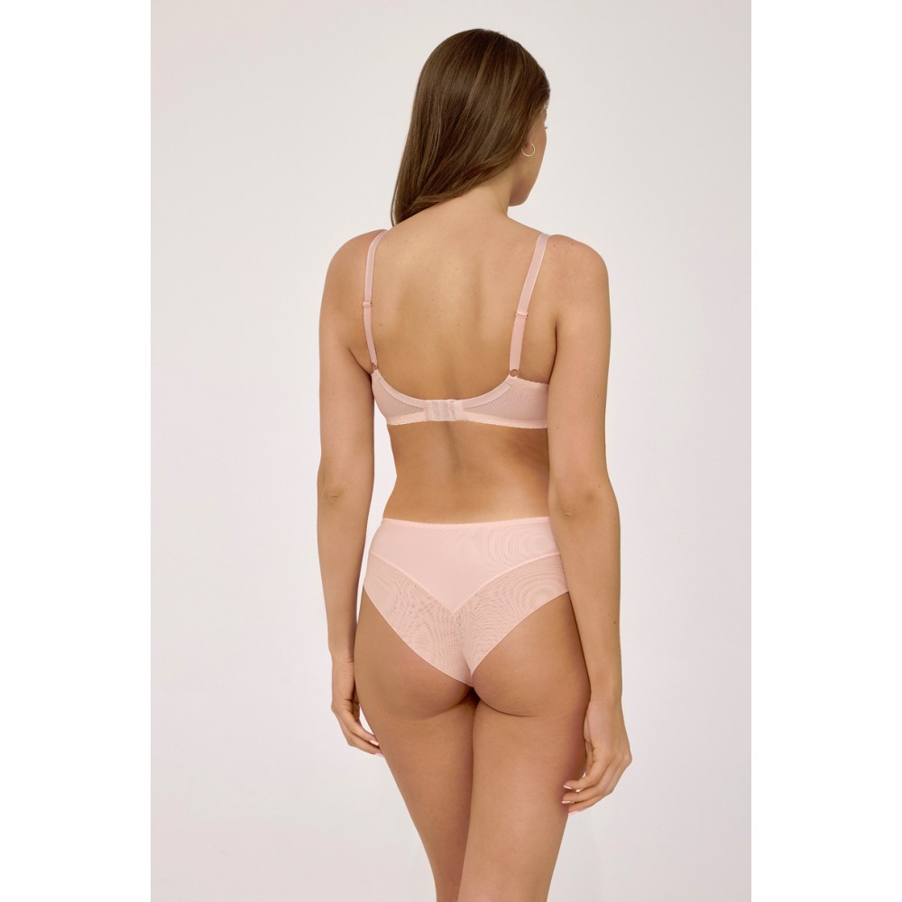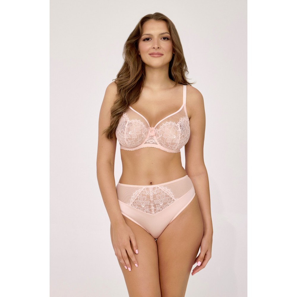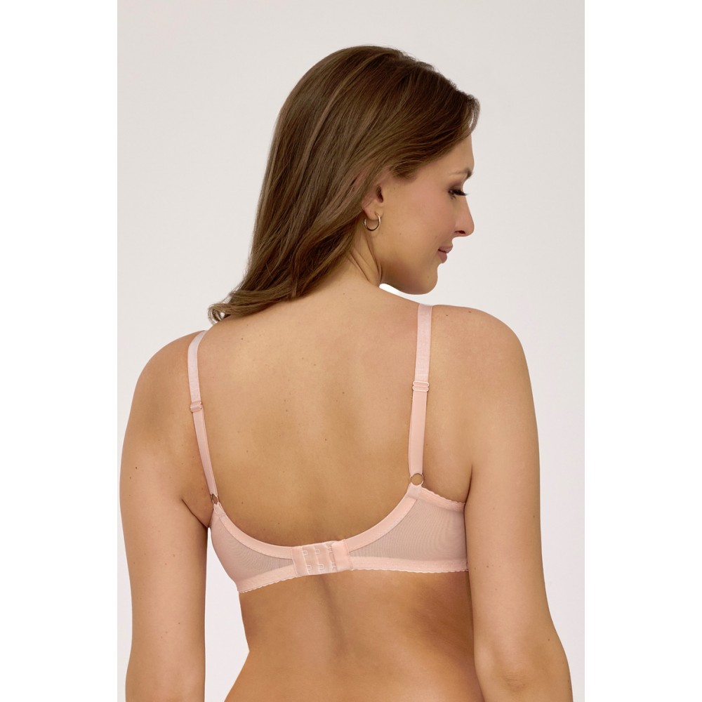 Model AV 2222 w odcieniu subtelnej moreli to połączenie zmysłowej lekkości i wygody. Transparentne miseczki wykonano z delikatnej siateczki ozdobionej bogatą koronką w kwiatowe wzory, które pięknie układają się na piersiach. Konstrukcja typu soft zapewnia naturalne ułożenie biustu, jednocześnie stabilnie go podtrzymując. Uroku całości dodaje mostek wykończony efektownym chwostem, a tył z elastycznej dzianiny gwarantuje pełną wygodę noszenia przez cały dzień. Do kompletu przygotowano dwa fasony majtek