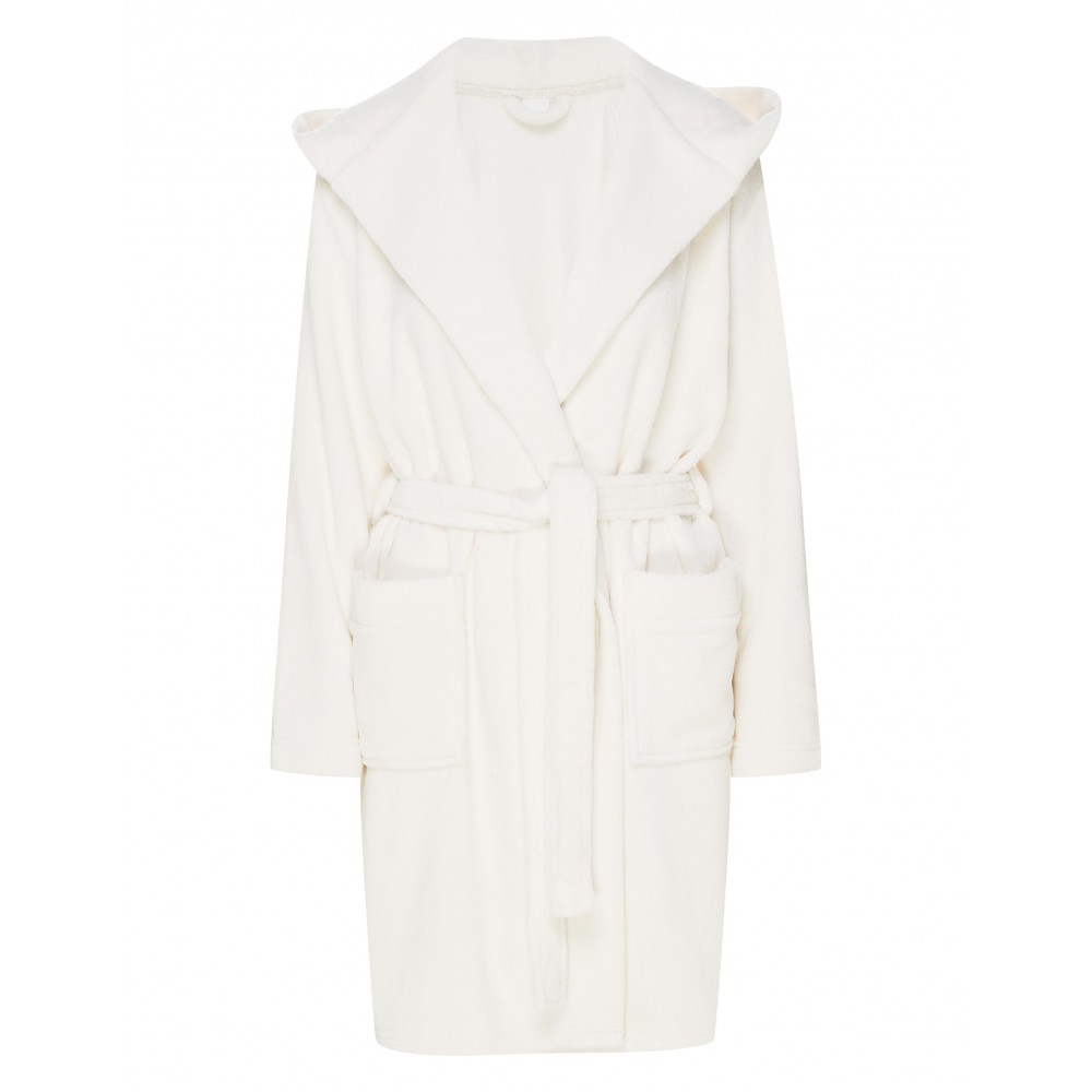 Жіночий халат з капюшоном з м'якої, гладкої трикотажної тканини. Зав'язка на талії, дві зовнішні киш..
