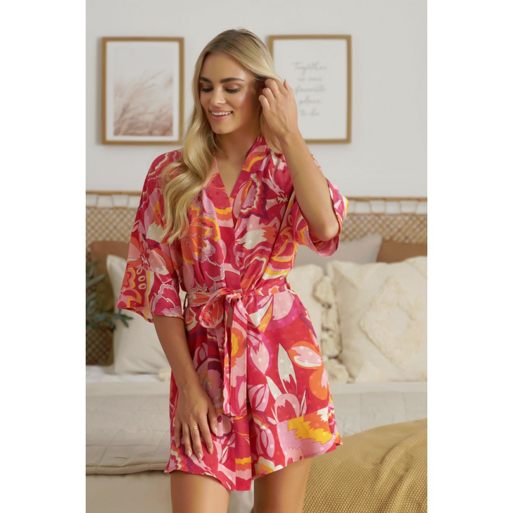 Жіночий халат з рукавами 3/4, виготовлений з м'якої віскози з візерунком. Халат зав'язується на талії та опускається нижче коліна.