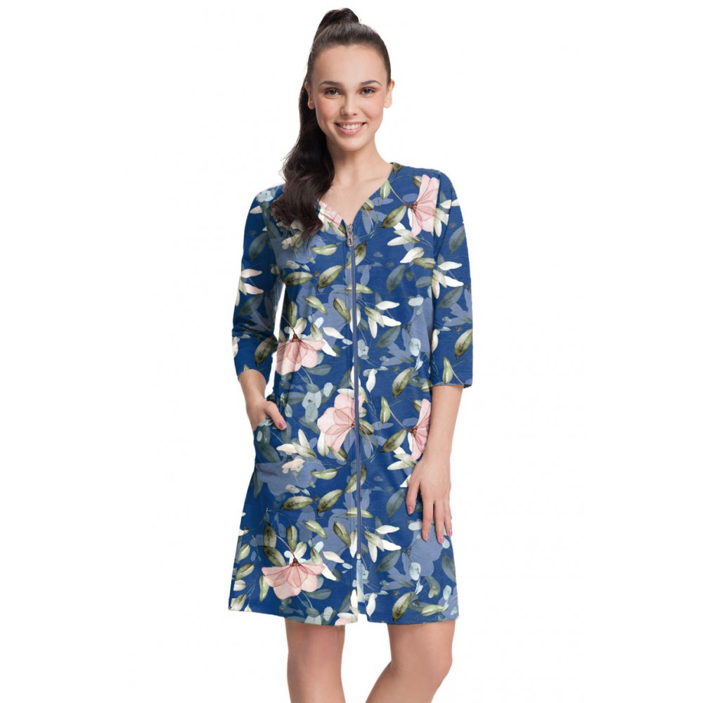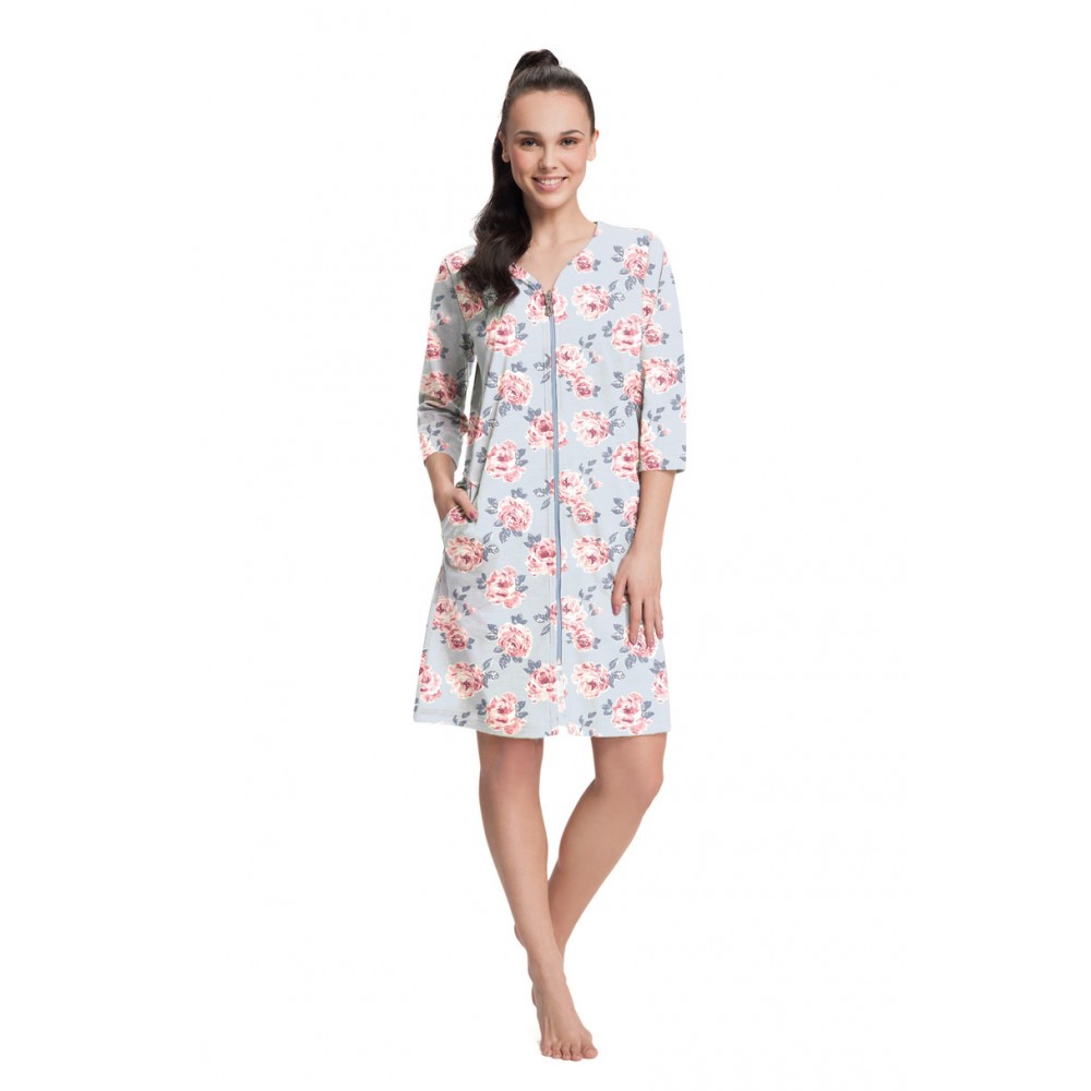 Цей халат має заокруглений V-подібний виріз горловини, який ніжно підкреслює шию, а рукави довжиною 3/4 забезпечують свободу рухів. Практичні кишені дозволяють зберігати дрібні предмети, такі як телефон або серветки. Цей халат, що застібається на зручну блискавку, ідеально підходить як для відпочинку вдома, так і для ранкових зборів.