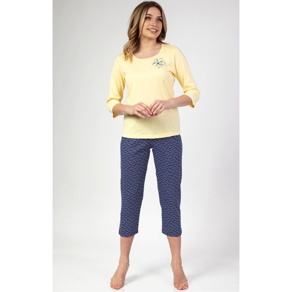 Жіноча бавовняна піжама з ніжним квітковим принтом. Верх має рукави 3/4 та круглий виріз. Штани з ві..