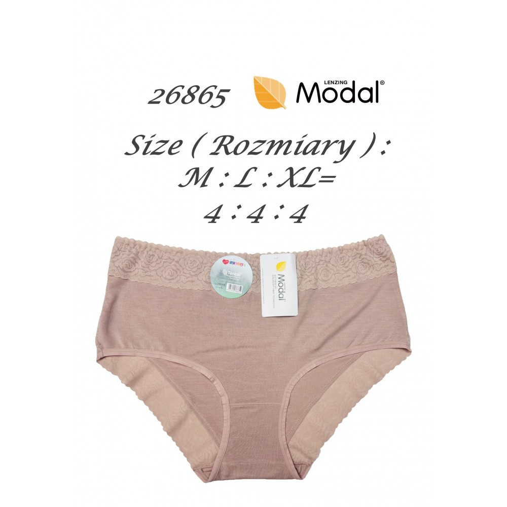 Жіночі пишні труси з високими бортами, оздоблені ніжним мереживом. Виготовлені з дуже м'якого матеріалу. Упаковані в упаковки по 12 штук у різних кольорах та розмірах (S, M, L, XL). Склад: 94% модал, 6% еластан.