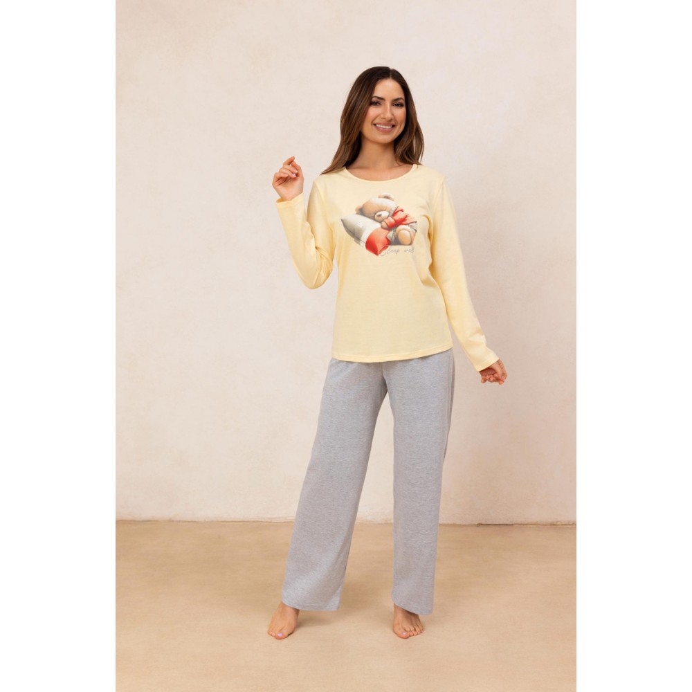 Залишайтеся в теплі та комфорті прохолодними вечорами з чарівною жіночою піжамою 728 BIG J/25, виготовленою зі 100% м'якої бавовни. Футболка з довгими рукавами, круглим вирізом та чарівним барвистим принтом ведмедика на грудях додає ніжності. Довгі однотонні штани зі зручним еластичним поясом з бавовняною обробкою гарантують ідеальну посадку, яка не тисне. Це чудовий вибір для жінок, які цінують комфорт, натуральні тканини та дівочий стиль. Ідеально підходить як для сну, так і для комфортного домашнього вбрання.