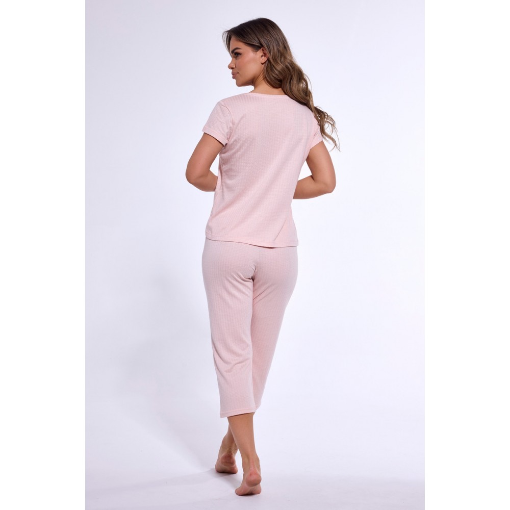 Жіноча піжама KR 851/325 JOAN – це унікальне поєднання комфорту, елегантності та жіночного стилю. Виготовлена з високоякісного трикотажу з додаванням чесаної бавовни та модалу, вона пропонує шовковисту м'якість, довговічність та повітропроникність – ідеально підходить для весняних та літніх вечорів. Комплект включає гладкий топ з короткими рукавами та штани довжиною 7/8 для повної свободи рухів. Декоративний бант прикрашає талію, додаючи їй витонченості. Ніжний пастельний відтінок рожевого підкреслює жіночний характер комплекту. Ідеально підходить для щоденного носіння або як подарунок – виглядає чудово та приємно на дотик.