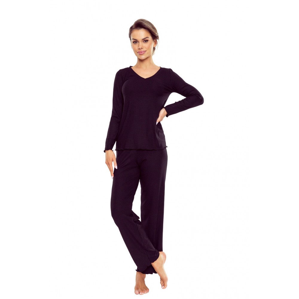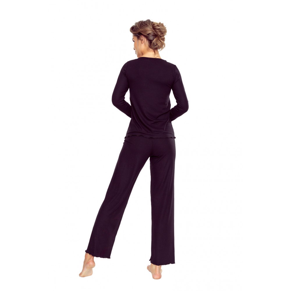 Жіноча піжама Rosaria поєднує в собі елегантність та комфорт, розроблена для жінок, які цінують комфорт і стиль навіть у затишку власного дому. Виготовлена з легкої ребристої віскози, вона ніжно облягає тіло та дозволяє шкірі дихати. Блузка з V-подібним вирізом ніжно підкреслює силует, а декоративний поділ додає жіночності. Прямі довгі штани гарантують повний комфорт та свободу рухів. Ідеально підходить як нічна сорочка або стильний одяг для відпочинку вдома.