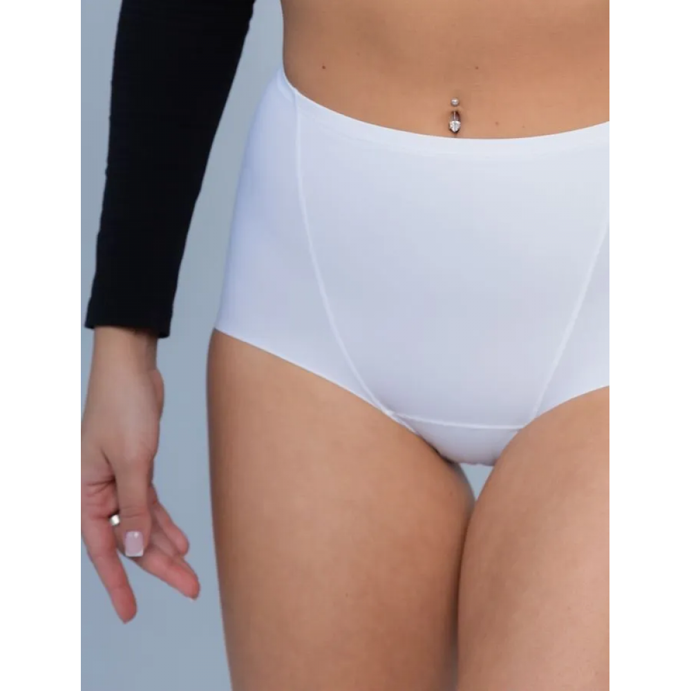 Трусики сліп з еластичного трикотажного полотна з високою лінією талії. Лазерна обробка нижніх зрізів. Конструкція трусиків забезпечує комфортну посадку на тілі та легкий корегуючий ефект завдяки подвійній передній деталі.