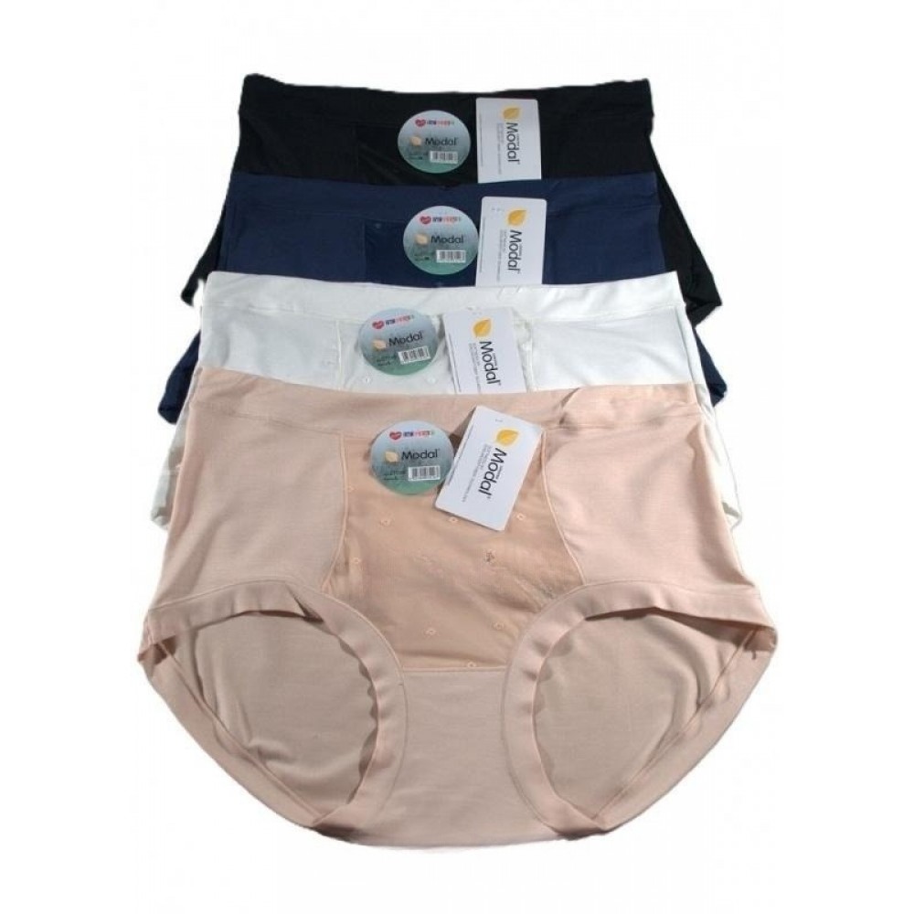 Жіночі труси з ніжного модалу. З високою талією, з вбудованою бічною панеллю. Упаковані в упаковках по 12 штук у міксі кольорів. Розміри в упаковці (M, L, XL, XXL, XXXL). Склад: 94% модал, 6% еластан.