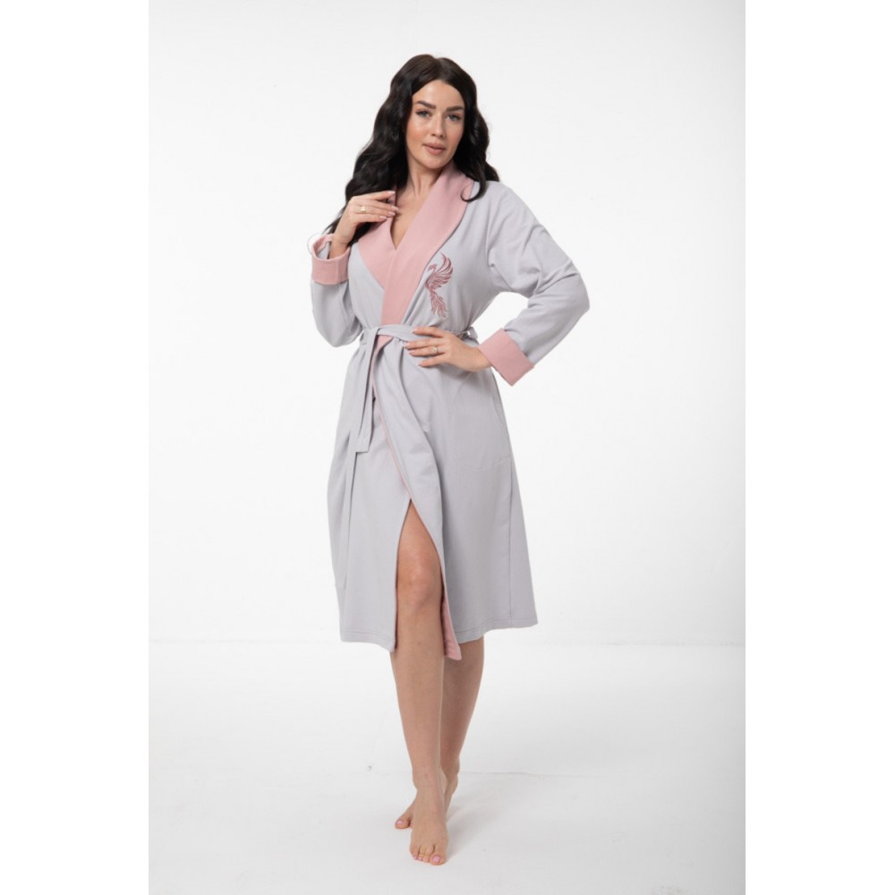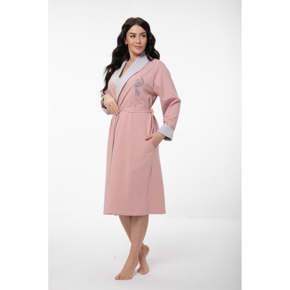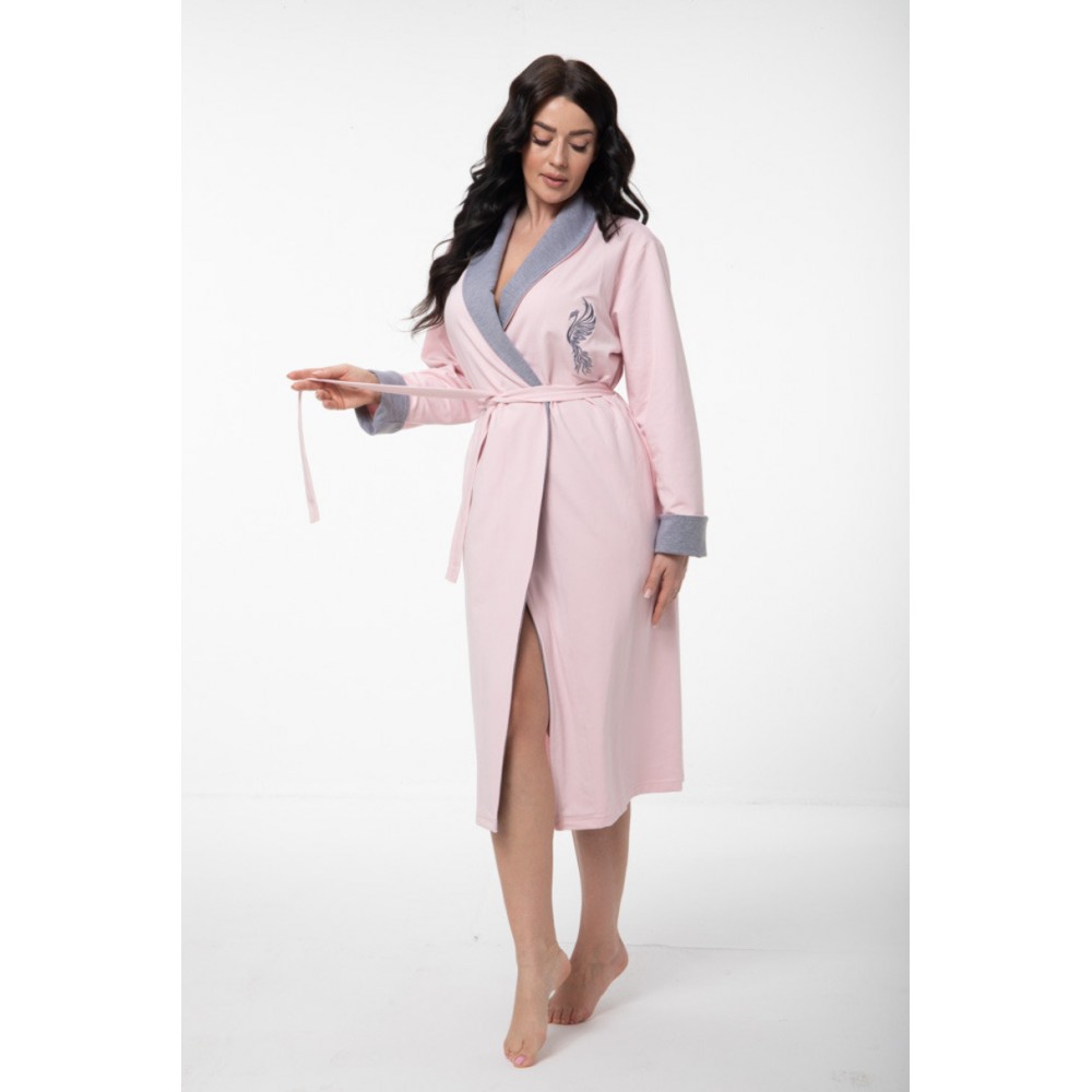 Жіночий халат FR-386 Dorota — це елегантність і комфорт найвищого ґатунку! Виготовлений зі 100% високоякісного бавовняного трикотажу , він м'який, дихаючий і приємний до тіла. Контрастний комір-шаль додає унікальності, а зав'язка на талії забезпечує ідеальну посадку. Довгі рукави гарантують тепло та комфорт, а практичні кишені на стегнах роблять його неймовірно функціональним.
