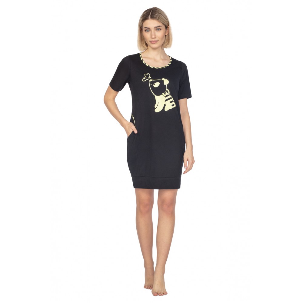 Жіноча бавовняна сорочка. Круглий виріз горловини, короткі рукави. Принт спереду, кишені на стегнах, виріз горловини та кишені оздоблені смугастою окантовкою. Склад: 100% бавовна.