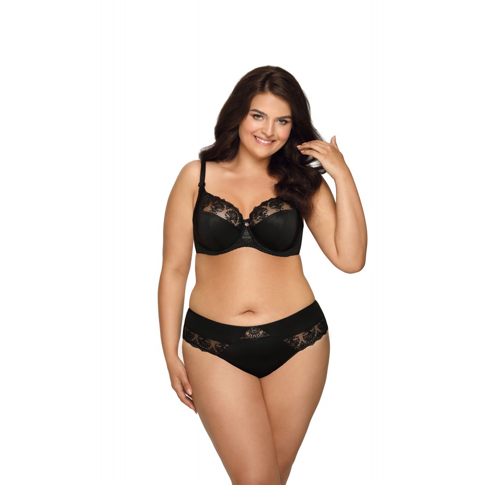 М'який бюстгальтер з еластичної тканини в нижній частині чашки. Прозора вишивка у верхній частині підкреслює форми та відкриває овал бюста. Бретелі невідстібаються, дворядний, триступеневий гачок. Склад: 88% поліамід, 8% бавовна, 4% еластан.
