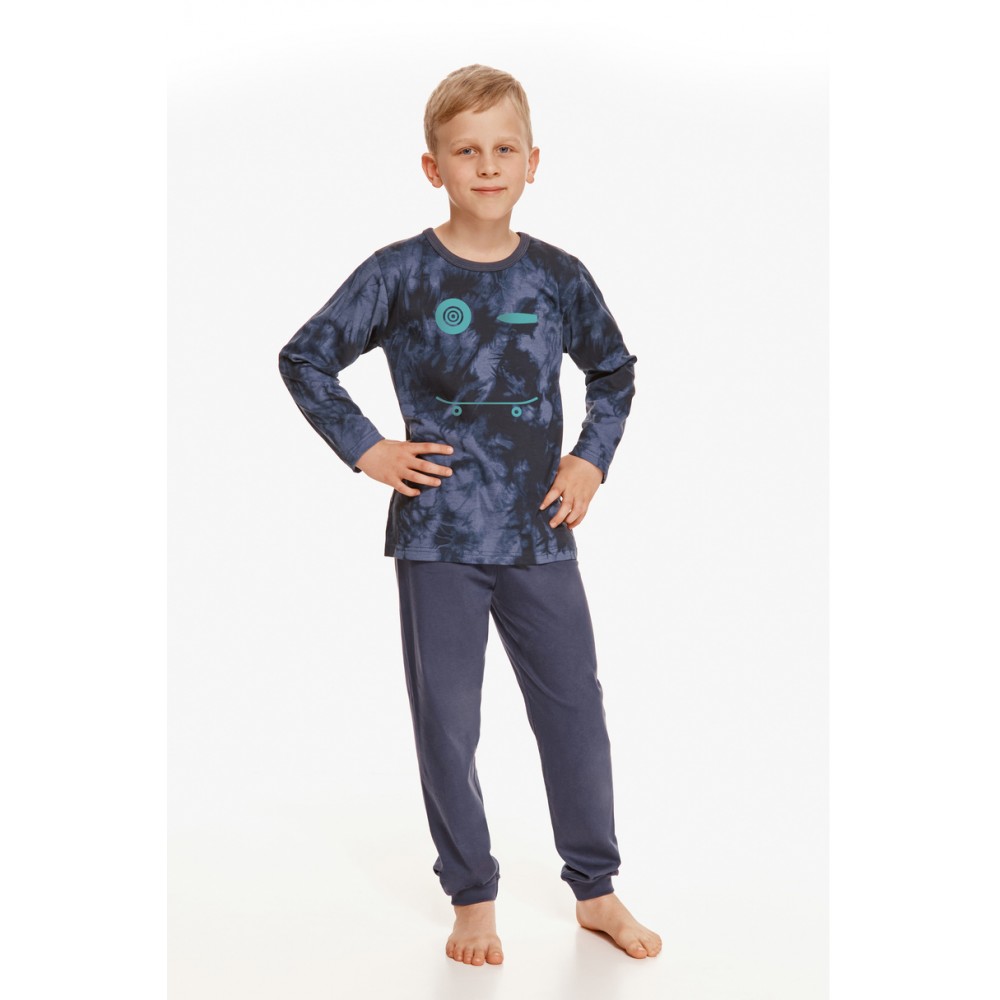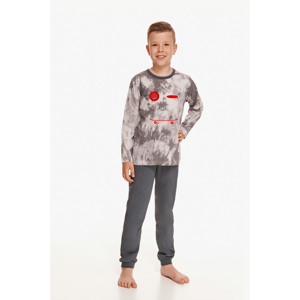Піжама для хлопчика з м'якої високоякісної бавовни. Футболка з довгими рукавами має яскравий принт спереду. У комплекті довгі однотонні штани зі зручним поясом на шнурку.