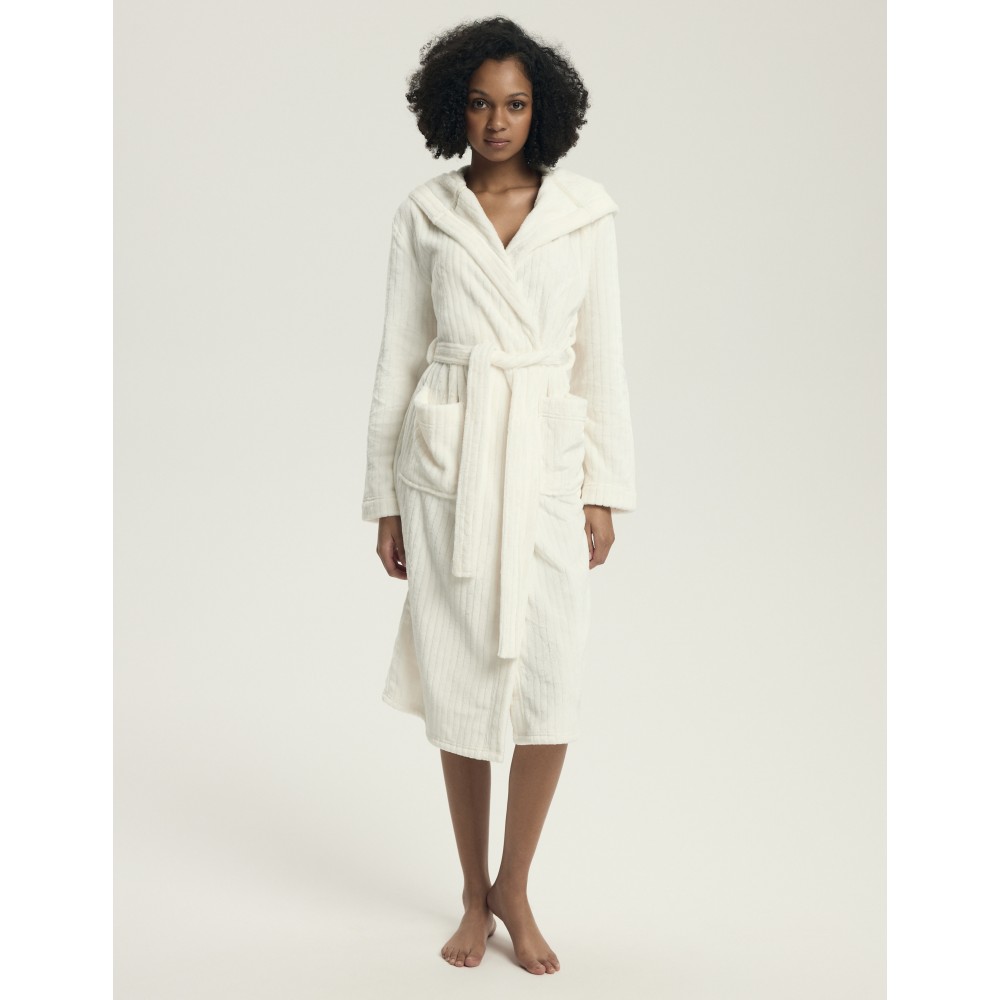 Жіночий халат з капюшоном виготовлений з м'якої, гладкої трикотажної тканини, оздоблений ніжним рель..