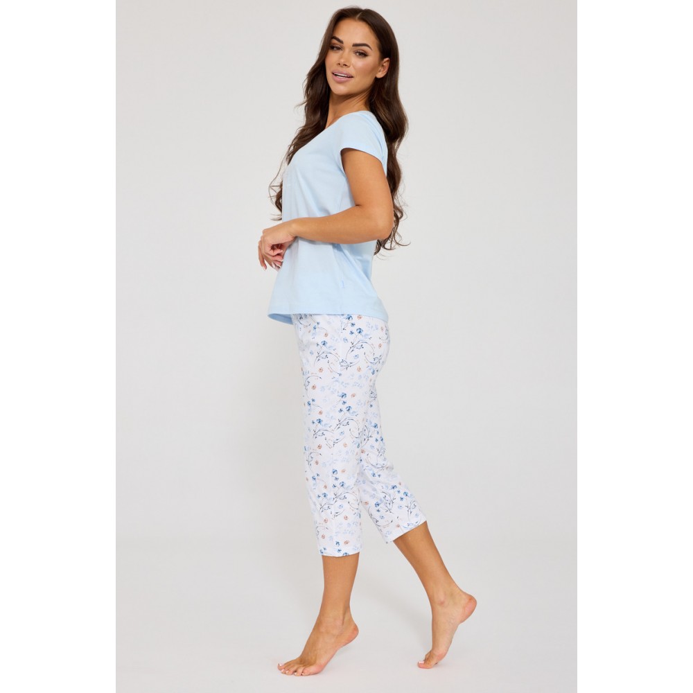 Комплект включає футболку з короткими рукавами та ніжним принтом на грудях та дві пари штанів – шорти та капрі – що дозволяє підібрати комплект відповідно до ваших поточних потреб та температури. Чарівний квітковий візерунок та атласний бант на талії додають піжамі жіночності та романтики. Комплект упакований в елегантну коробку, що робить його ідеальним подарунком.