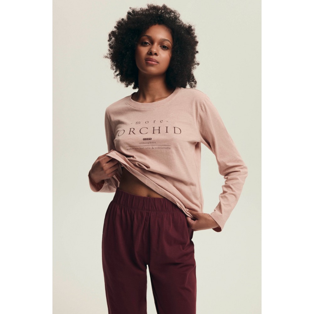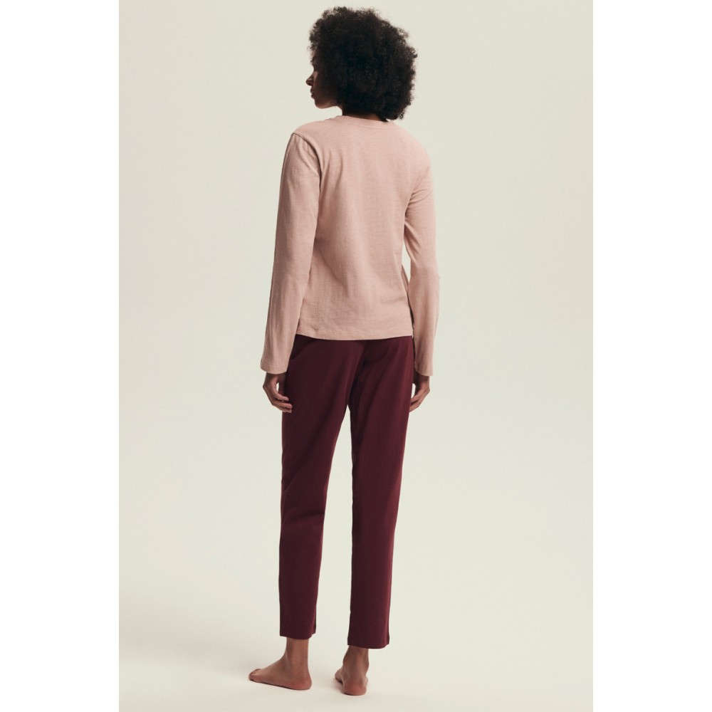 Відкрийте для себе винятковий комфорт та стиль у жіночій піжамі DORLA 43733 AW25. Цей комплект із двох предметів складається з топа з довгими рукавами ніжного рожевого відтінку з тонким принтом та бордових штанів з еластичним поясом. Виготовлена зі 100% м'якої бавовни, ця піжама гарантує комфорт протягом усієї ночі, а також ідеально підходить для лінивих ранків або тихих вечорів. Натуральна тканина дихає та доглядає за вашою шкірою, не викликаючи подразнення. Ідеально підходить для жінок, які цінують поєднання комфорту та естетики в домашній обстановці.