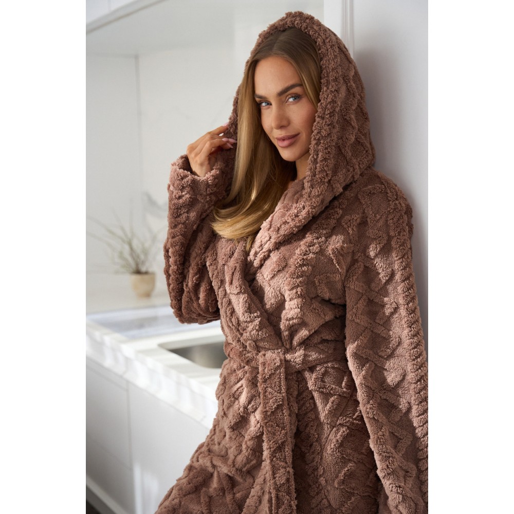 Жіночий короткий халат 2401 ідеально підходить для жінок, які цінують комфорт і затишок щодня. Виготовлений з надзвичайно м'якої трикотажної тканини з тисненим рельєфним візерунком , він облягає тіло та забезпечує приємне тепло. Капюшон , довгі рукави та зав'язка на талії роблять його ідеальним вибором для ранку та вечора в затишку дому. Дві практичні зовнішні кишені дозволяють зберігати дрібні речі або зігрівати руки. Коротка довжина робить його легким та зручним у носінні. Цей халат ідеально підходить для прохолодних днів та як повсякденний домашній одяг.
