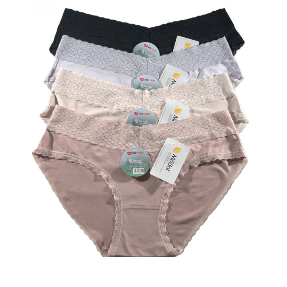 Жіночі труси з м'якого модалу, оздоблені ніжним мереживом. Упаковка з 12 шт. різних кольорів. Різні розміри (S, M, L, XL). Склад: 94% модал, 6% еластан.