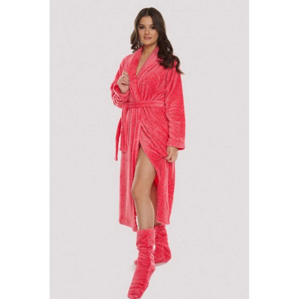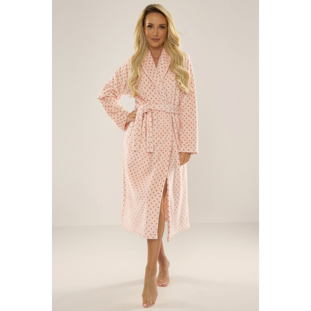 Жіночий довгий халат з м'якої трикотажної тканини, з коміром та візерунком у горошок. Зав'язки на талії та кишенях.