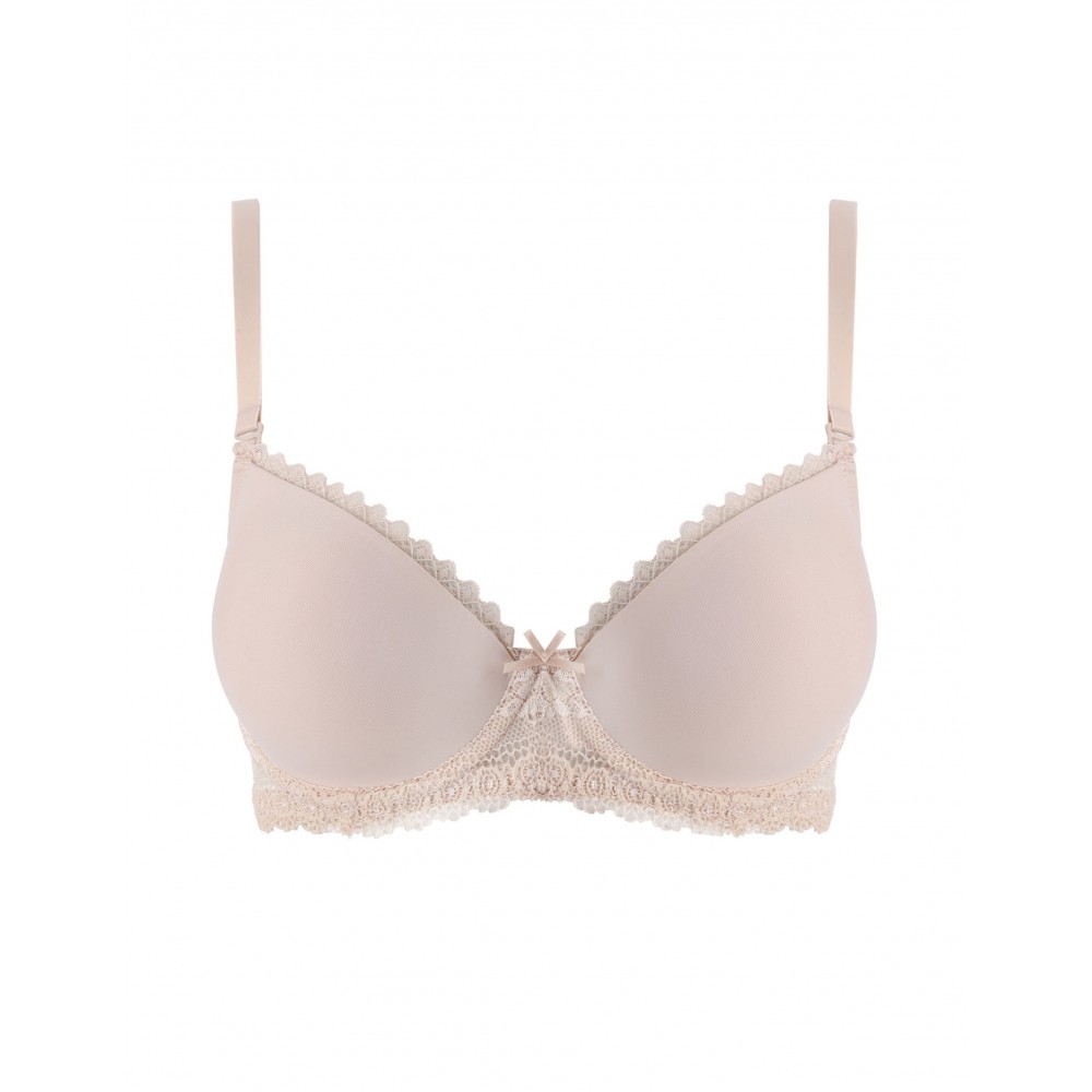 Гладкий бюстгальтер пуш-ап на кісточках з гладкими чашечками та знімною підкладкою. Чашечки та стрічка з мереживною обробкою, регульовані знімні бретельки (більші розміри мають незнімні бретельки). Склад: 85% поліамід, 15% еластан.