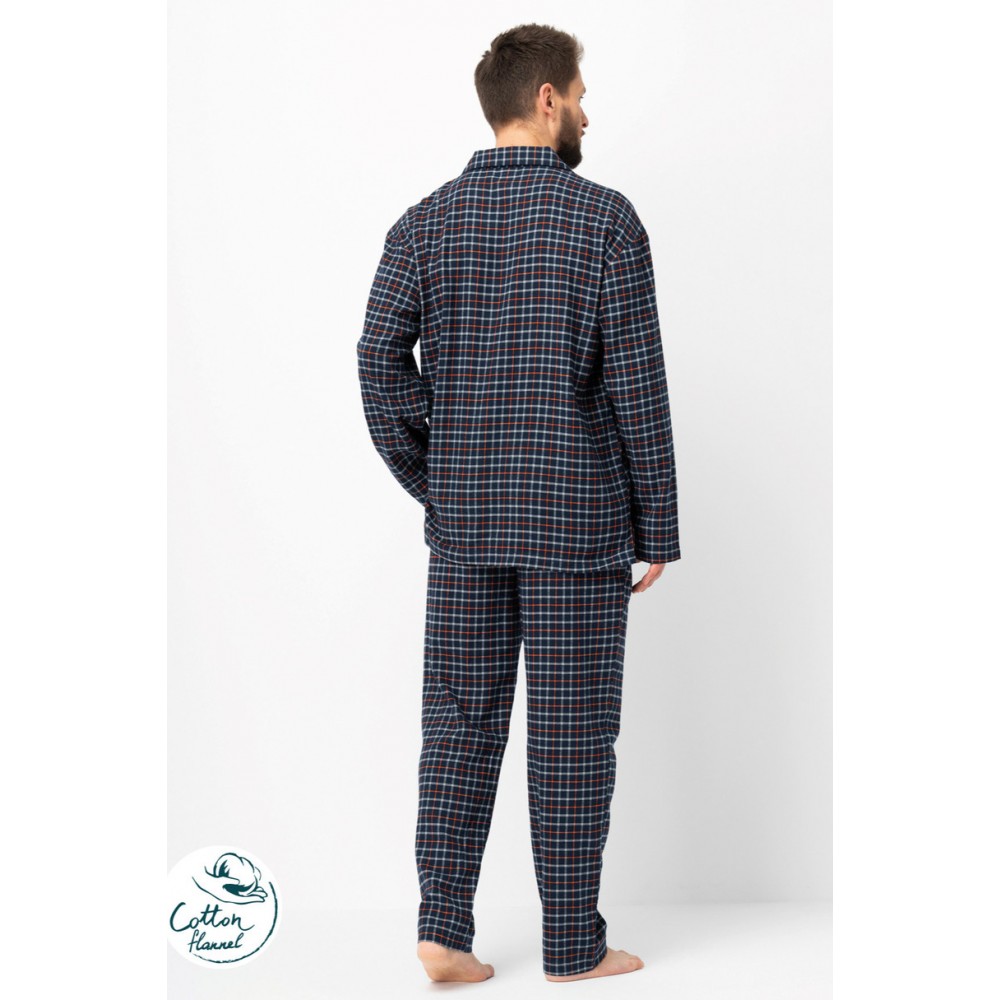 Чоловіча піжама з високоякісної бавовняної фланелі, що забезпечує тепло та винятковий комфорт під час сну. Комплект включає сорочку на ґудзиках з коміром та нагрудною кишенею, а також штани вільного крою з еластичною талією. Ніжний картатий візерунок у відтінках темно-синього, синього та червоного надає всьому комплекту елегантного, класичного вигляду. М'який та дихаючий матеріал робить цю піжаму ідеальною для осінніх та зимових вечорів.