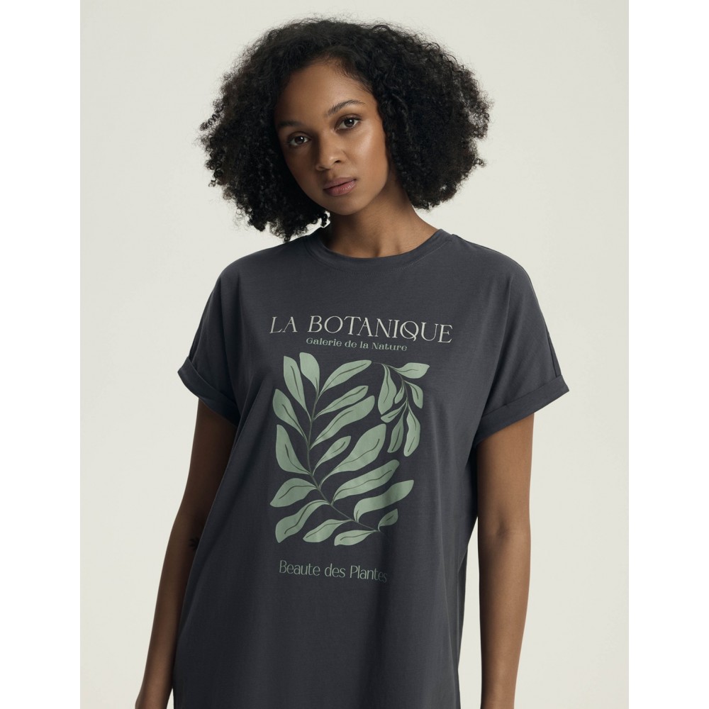 Жіноча бавовняна сорочка з короткими рукавами. Спереду оздоблена літерами, має круглий виріз горловини та довжину вище коліна. Склад: 100% бавовна.