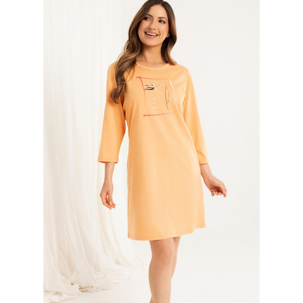 Жіноча бавовняна сорочка. Рукава 3/4, круглий виріз горловини, довжина до коліна. Передня частина оздоблена принтом. Склад: 100% бавовна.