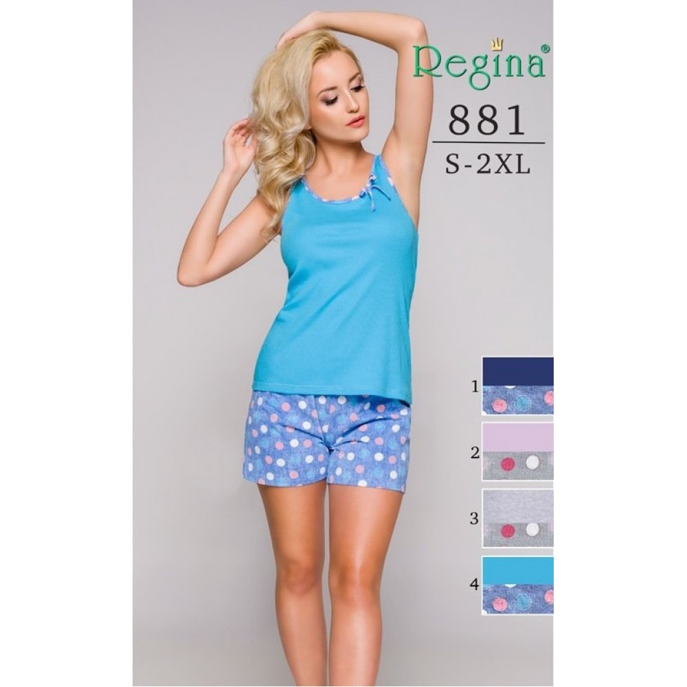 Жіноча піжама з двох частин. Топ з ребристого трикотажу на широких бретелях. Ребристий виріз горловини з декоративним бантом, що пасує до кольору штанів. Візерунчасті шорти вільного крою. Склад: 100% бавовна.