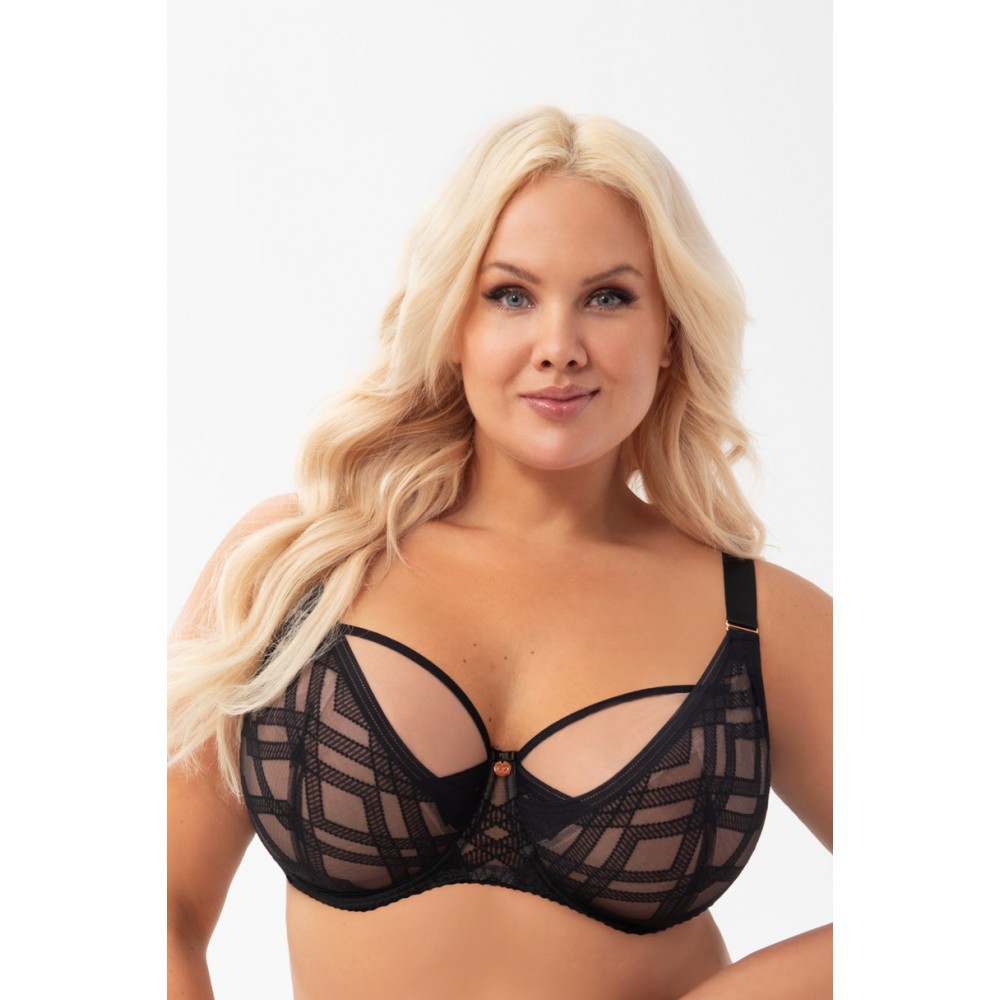 М'який бюстгальтер, призначений для жінок із розміром чашечки середнього та великого розміру. Забезпечує ефект підйому і збирання бюста всередину, чашки 3 предмета зі стійкого фатину, покриті додатковим шаром еластичного мережива. Верхній край оброблений гладкою стрічкою. Для підвищення комфорту використання верхній край пояса по окружності оброблений м'якою окантовкою. Приховані бічні кістки запобігають згортанню матеріалу. Спинка з непрозорої лайкри в поєднанні з еластичним мереживом і тюлем. Залежно від розміру дво- або трирядні гачки з триступеневою регулюванням окружності. Невідстібні, регульовані лямки трьох ширин. Невідстібні, регульовані лямки трьох ширин. Металеві елементи з рожевого золота (без нікелю) Склад: 90% поліамід, 7% еластан, 3% поліестер