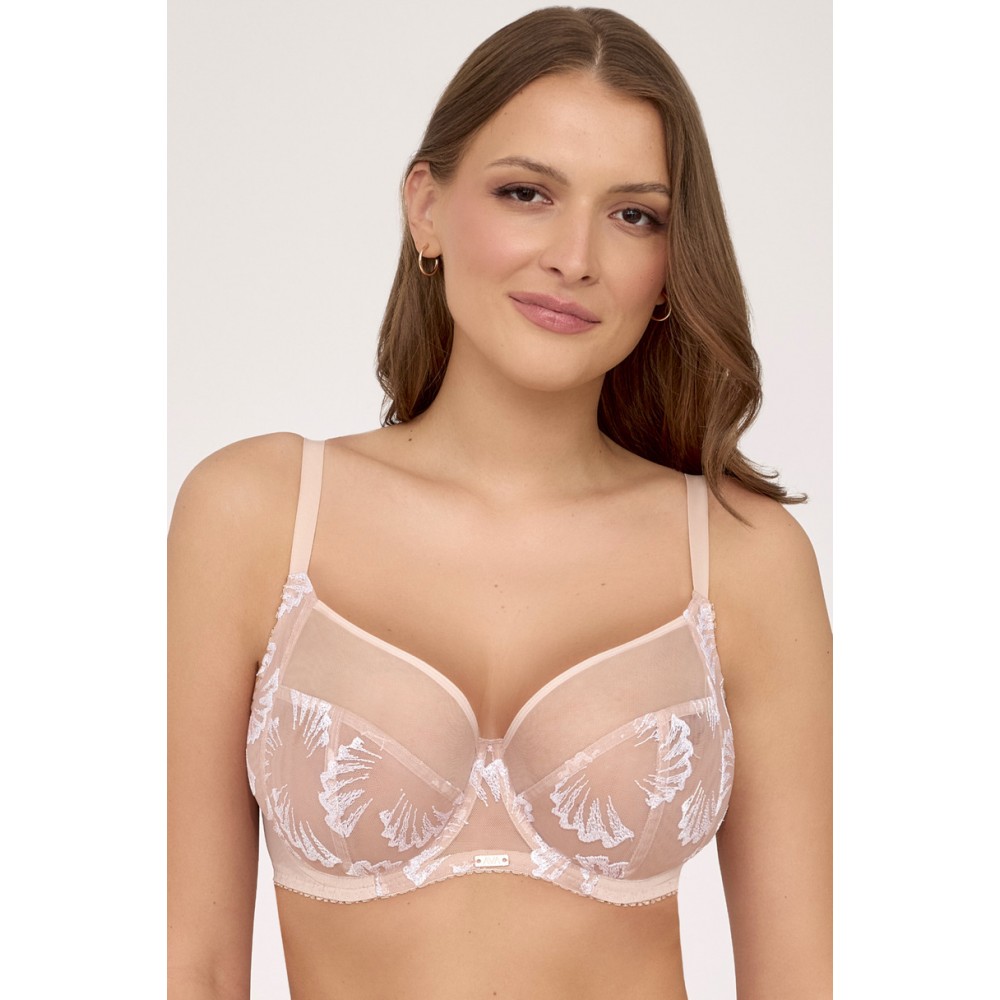 М'який бюстгальтер з бежевими тюлевими чашками з білою вишивкою, бюстгальтер зручно збирає і підтрим..