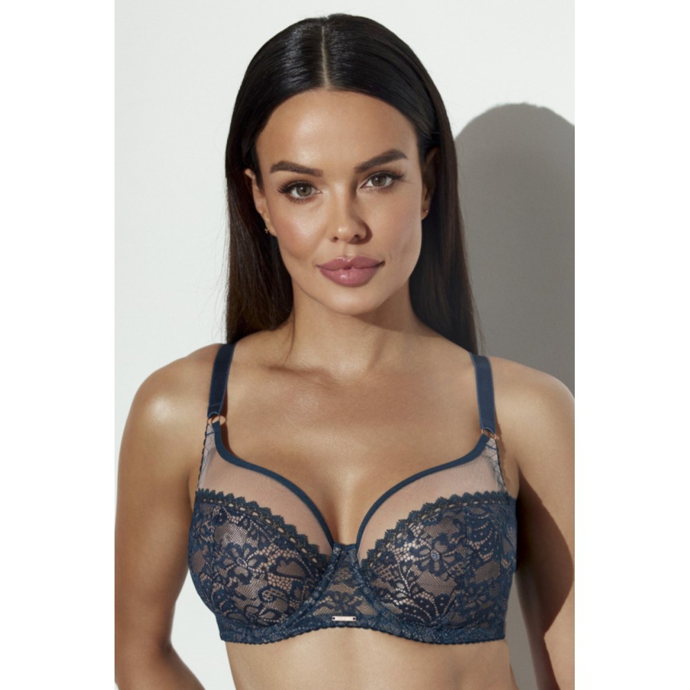 Model wykonany jest z delikatnej, transparentnej koronki o pięknym roślinnym motywie, która subtelnie podkreśla naturalny kształt biustu. Miękkie, lekko prześwitujące miseczki nadają bieliźnie niezwykle kobiecego i eleganckiego charakteru, a jednocześnie zapewniają odpowiednie podtrzymanie.
