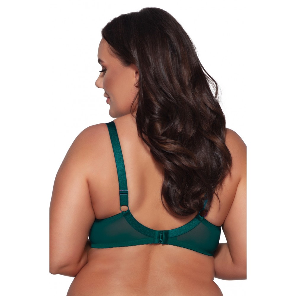 Biustonosz z miękkimi miseczkami, ktre pokryte zostały misternym haftem z połyskującą nicią. Transparentne tiulowe okienko tworzące się na mostku między szafirowymi ramami odciąża model i dodaje mu uroku. Obwód ze szmaragdowej dzianiny