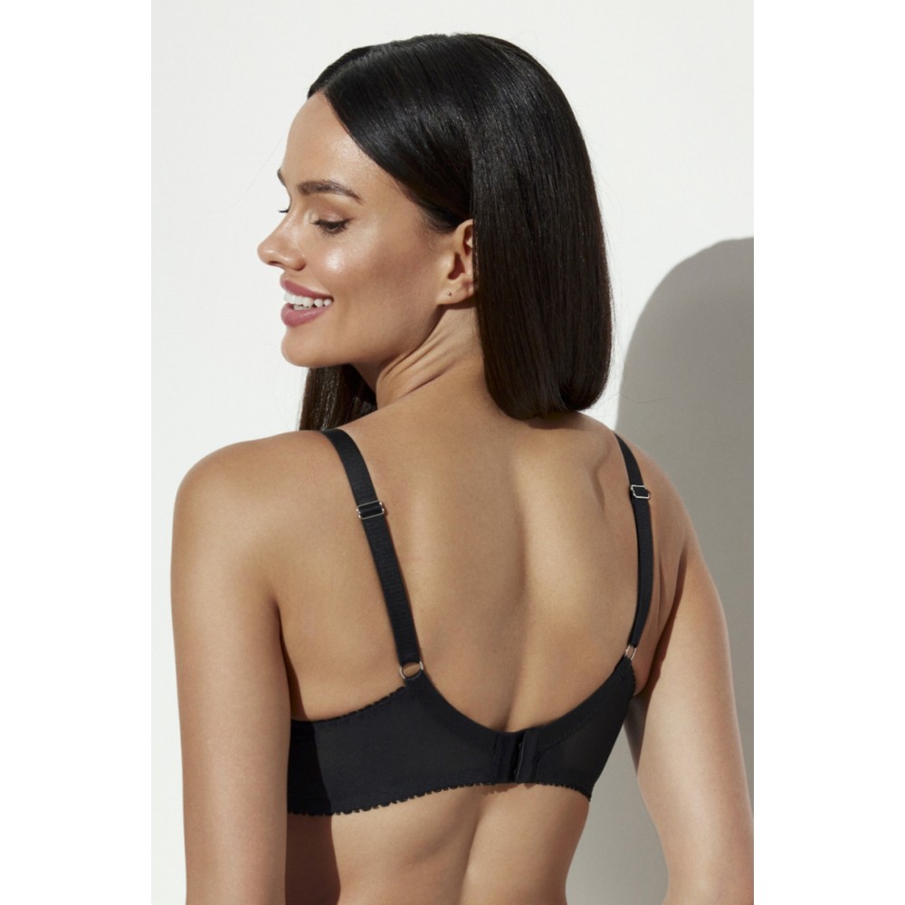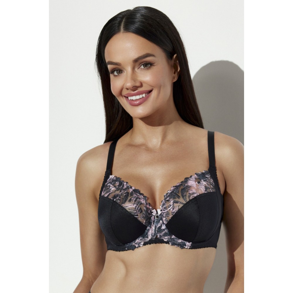 Postaw na klasykę z nutą romantyzmu, którą zapewni Ci model AV 2270 BLACK. Wyrafinowane połączenie klasycznej czerni z subtelnym, kwiatowym haftem w delikatnych różowych tonach, nadaje bieliźnie kobiecego i zmysłowego charakteru. Sprawdzona konstrukcja soft z miękkimi miseczkami subtelnie otula i podkreśla naturalny kształt biustu, zapewniając stabilne podtrzymanie. Regulowane ramiączka i klasyczne zapięcie na haftki gwarantują komfort przez cały dzień, a koronkowy detal na mostku pięknie łączy miseczki, dodając całości elegancji.