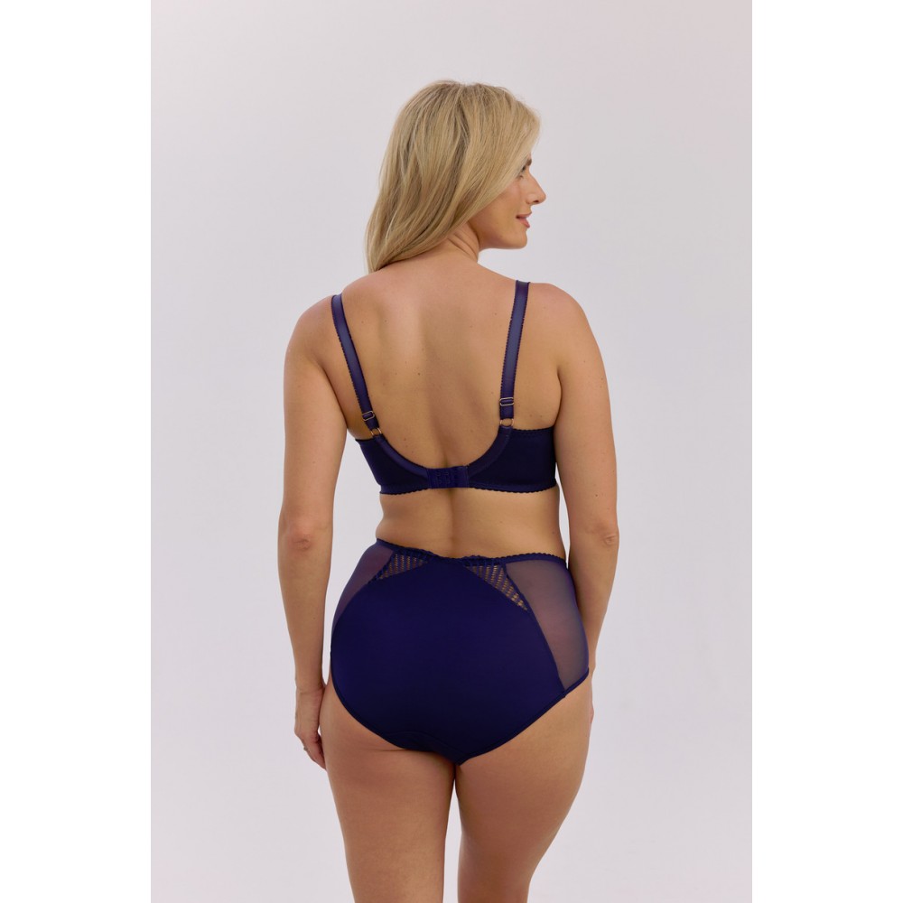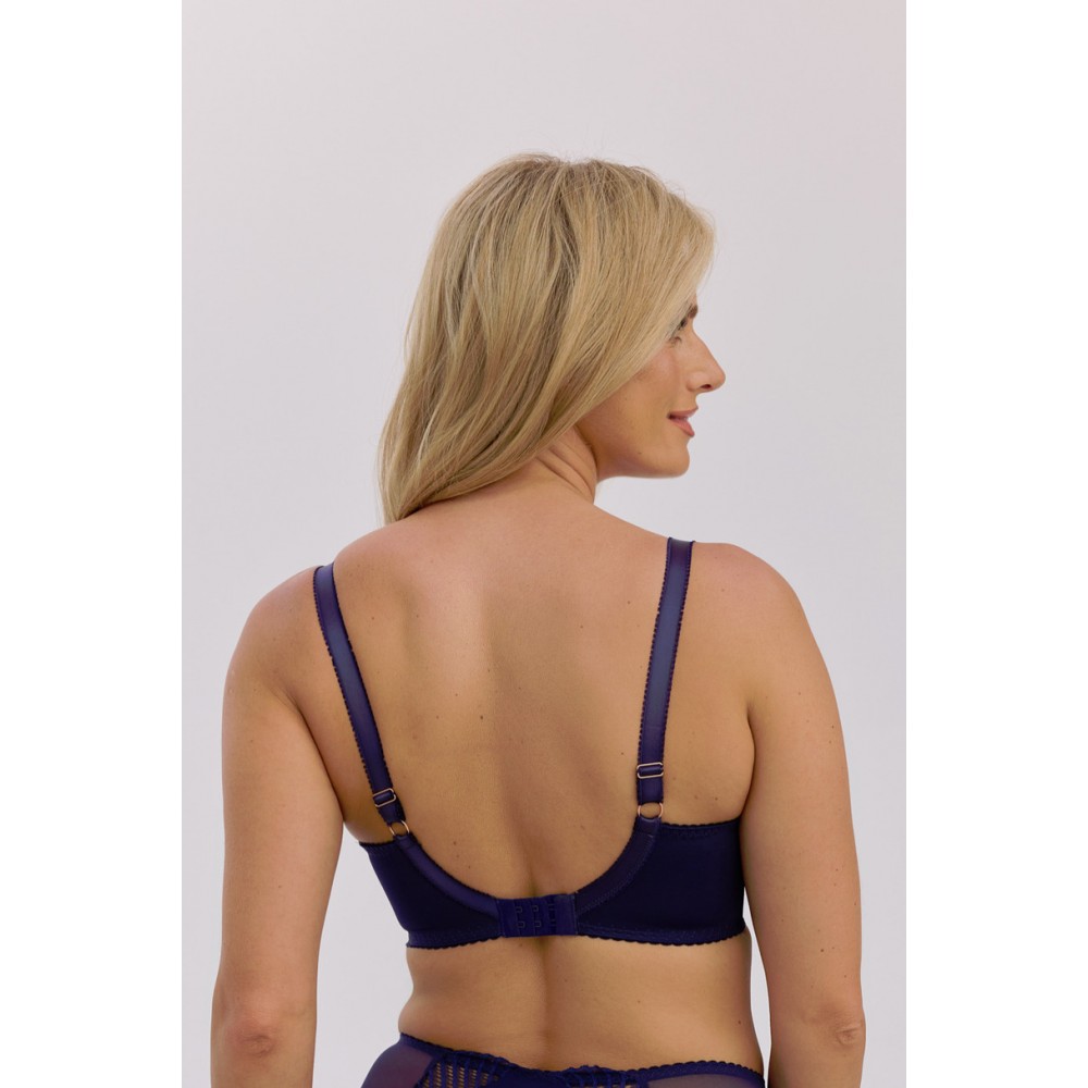 Biustonosz Semi–Soft Brigitta Art. 1365 to wyjątkowe połączenie elegancji i nowoczesnego stylu. Ozdobiony geometrycznym haftem w kolorze głębokiego granatu, prezentuje się niezwykle efektownie i kobieco. Konstrukcja typu semi–soft łączy miękką górną część miseczki z lekko usztywnionym dołem, co zapewnia doskonałe podtrzymanie i naturalne wymodelowanie biustu. Stabilny obwód i fiszbiny gwarantują wygodę, a biżuteryjny detal na mostku dodaje całości eleganckiego wykończenia. To model idealny zarówno do codziennego noszenia, jak i na wyjątkowe okazje.