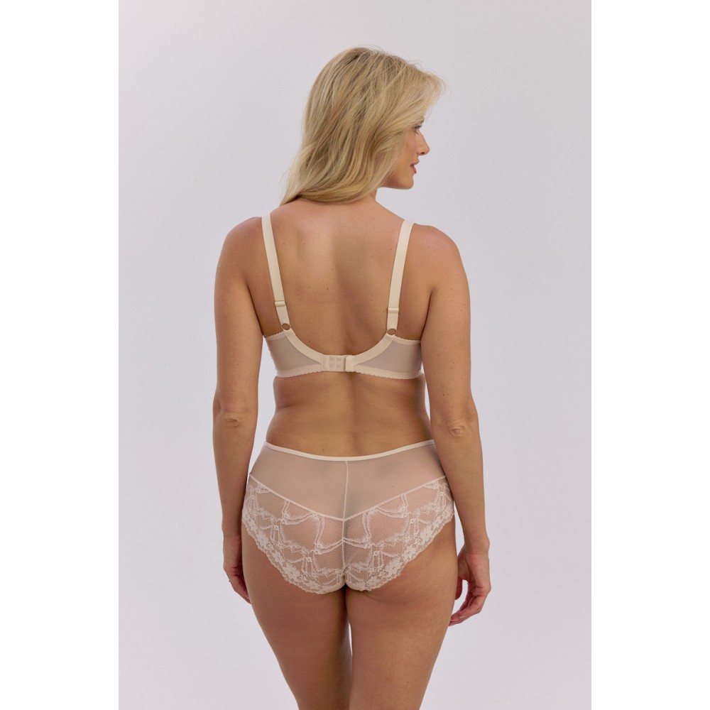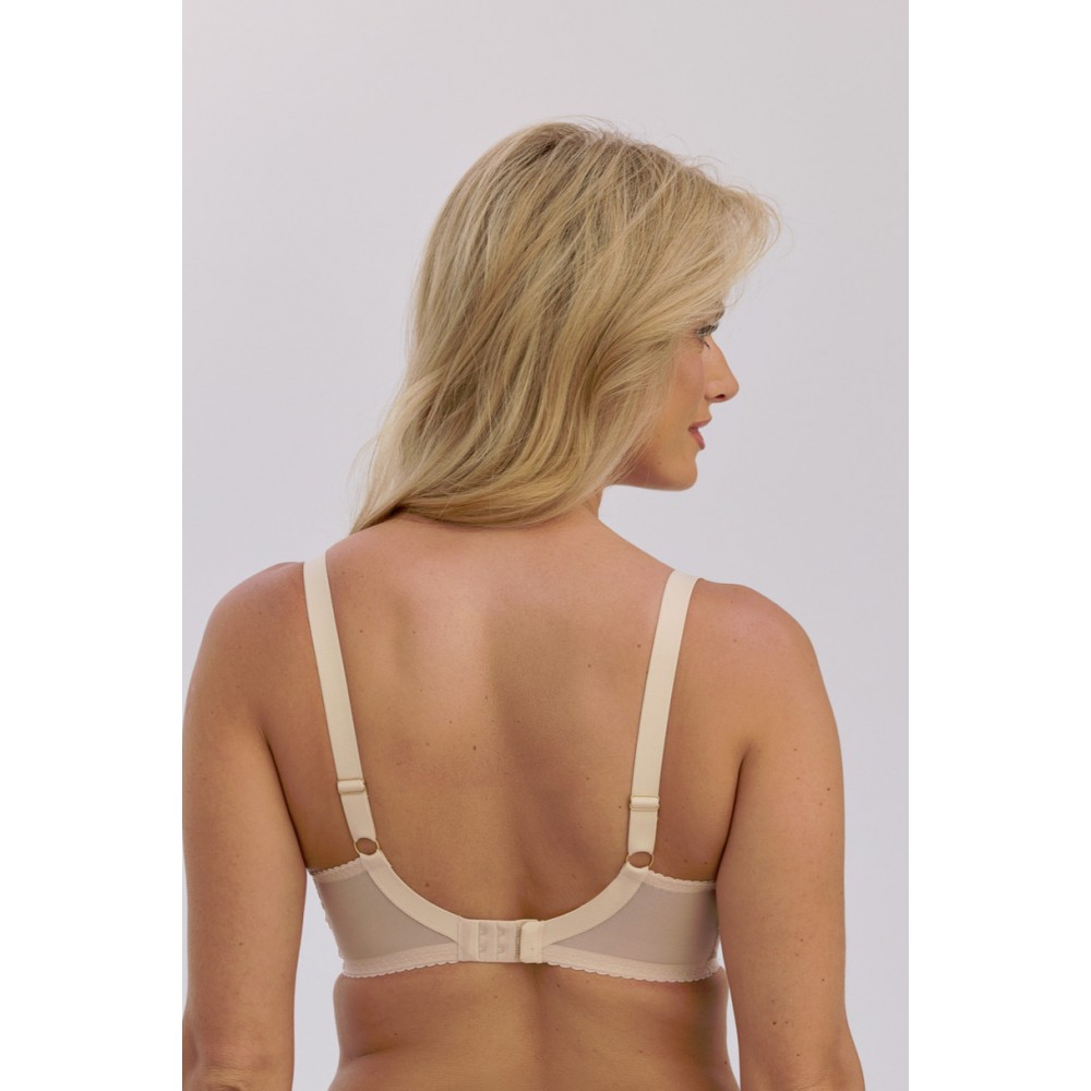 Biustonosz  Semi-Soft Selene Art. 1368 to wyjątkowe połączenie subtelności i funkcjonalności. Wykonany z delikatnej, beżowej koronki na transparentnym tiulu, pięknie podkreśla naturalny kształt biustu. Konstrukcja typu semi–soft z miękką górną częścią miseczki i lekko usztywnionym dołem gwarantuje idealne podtrzymanie oraz komfort przez cały dzień. Elegancki detal w postaci drobnej różyczki na mostku dodaje całości romantycznego uroku.