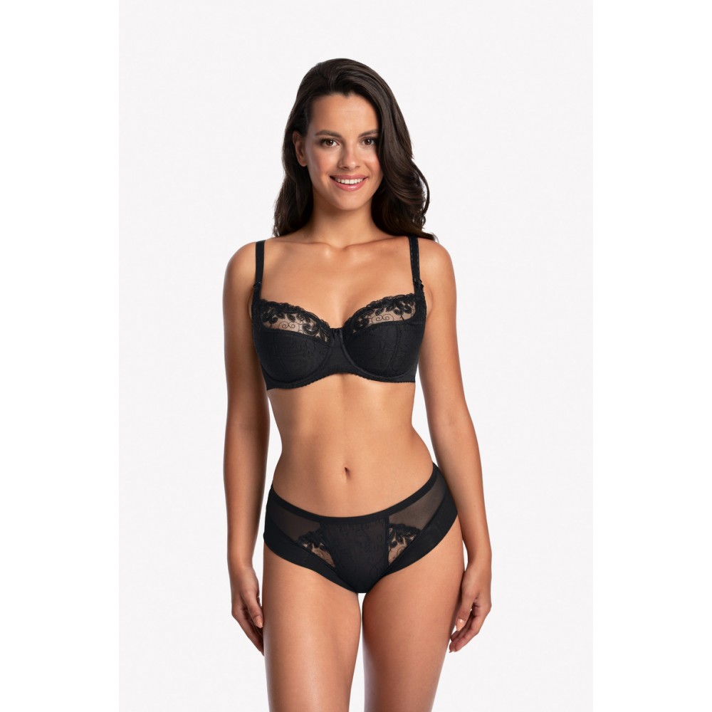 Бюстгальтер з напівпідкладкою (SS3). Ідеально центрує груди завдяки бічній підтримці. Зовнішня чашка обшита мереживом, а верхня частина прикрашена щільним, ніжним візерунком. Внутрішня чашка підкладена 100% бавовною. Задня частина виготовлена з лайкри. Без бічних кісточок. Ця модель створена для вибагливих жінок з великими грудьми.