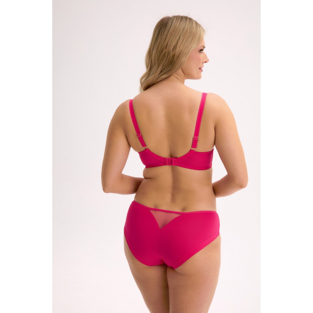 Цей бюстгальтер весна-літо 2010 року в насиченому рожевому відтінку – це квінтесенція жіночності та комфорту. Верхня чашечка виготовлена з легкого, прозорого тюлю, що додає нотку легкості та витонченості. Нижня чашечка виготовлена з ідеально контурного, підтримуючого піноматеріалу, покритого приголомшливою квітковою вишивкою, що забезпечує чудову підтримку та привабливий вигляд. Гумка з м’якої мікрофібри гарантує гнучкість та стабільність протягом дня. Це ідеальна модель для жінок, які цінують поєднання сміливого кольору, романтичних деталей та перевіреної конструкції.