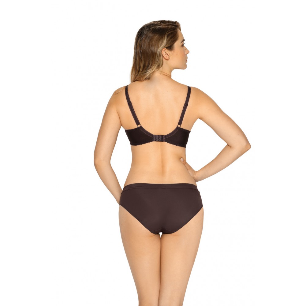 Напівпідкладковий бюстгальтер з легкою підкладкою та нижньою чашкою, обтягнутий приголомшливим трикотажним матеріалом з осіннім бордовим принтом. Верх виготовлений з чорного фатину, покритий вишивкою, що пасує до чашечки.
