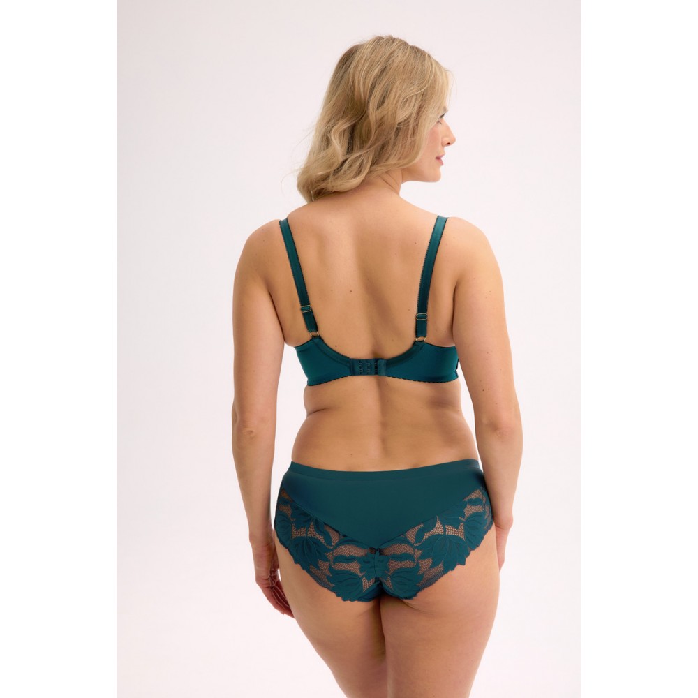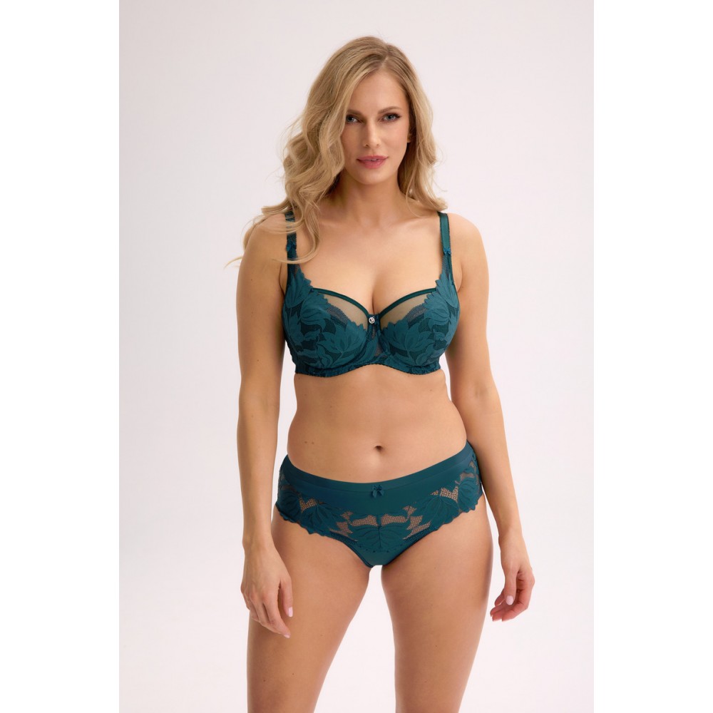 Напівм'який бюстгальтер Keto зеленого кольору – це сучасний варіант для жінок, які шукають поєднання комфорту та стильного дизайну. Його яскравий смарагдовий відтінок та велика квіткова вишивка на ніжній сітці привертають увагу. Чашечки з напівм'якою підкладкою ідеально формують груди, а закриті боки та широка стрічка забезпечують комфорт та підтримку протягом усього дня. Регульовані бретельки та класична застібка ззаду дозволяють персоналізувати посадку. Цей стиль ідеально підходить як для щоденного носіння, так і для особливих випадків – жіночний, елегантний та чуттєвий.