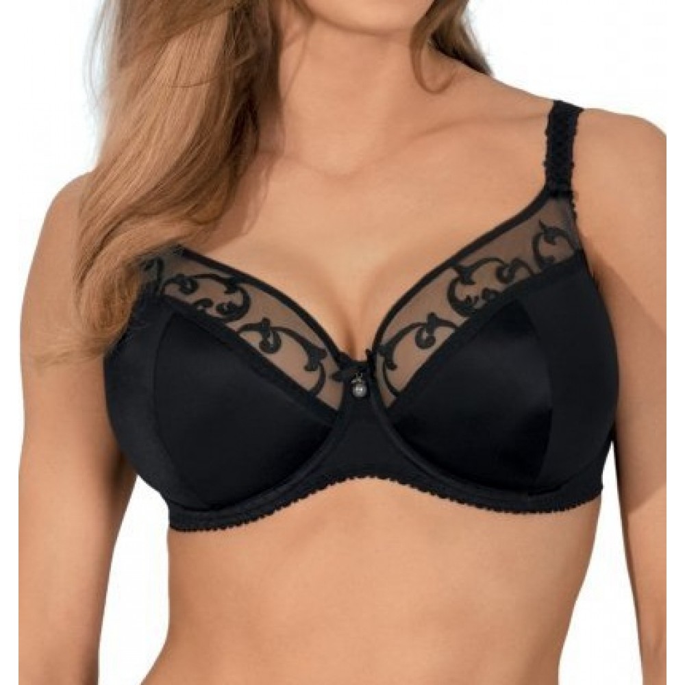 Красивий бюстгальтер балконет, прикрашений вишивкою, розміщеною на сітці з фатину. На чашках присбор..